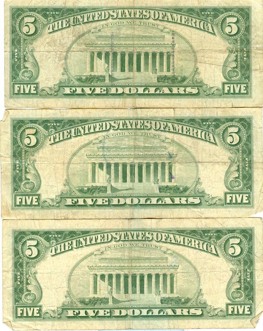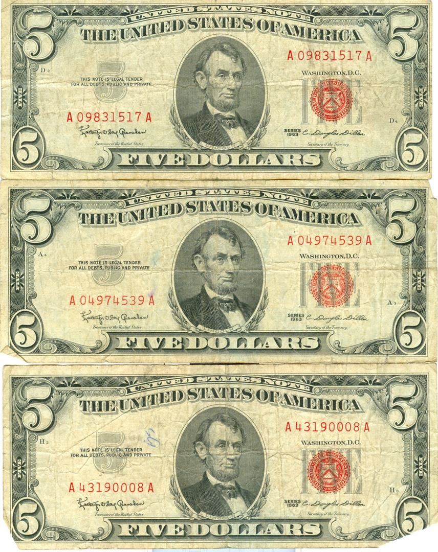 One 1963 $5 Red Seal Bill Lot of 3. The pictures represent the bills.