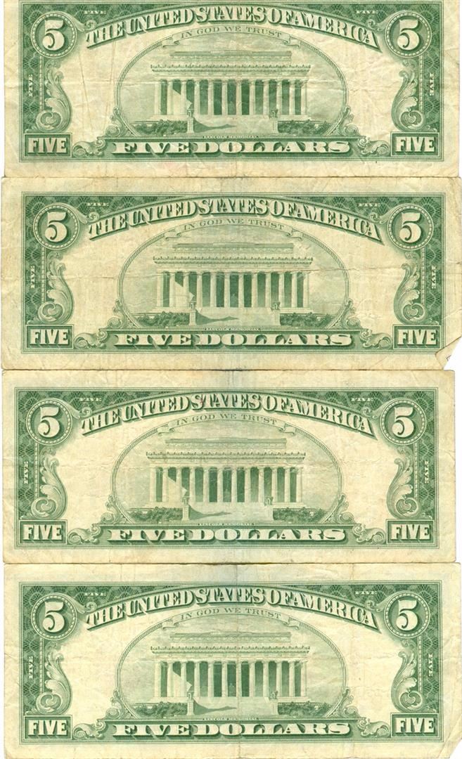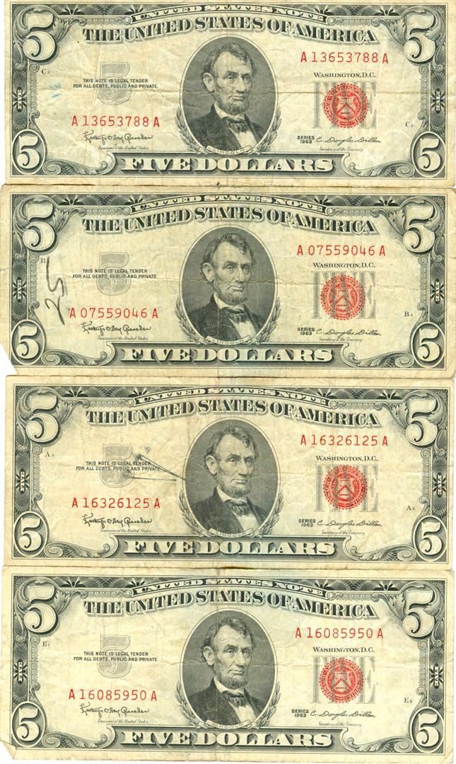 1963 $5 Red Seal Bill Lot of 4. Pictures represent the bills.