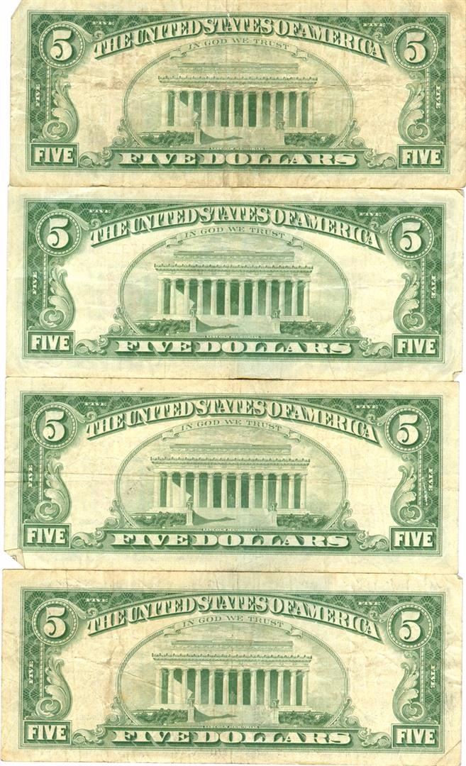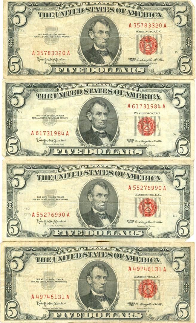 1963 $5 Red Seal Bill Lot of 4. Pictures represent the bills.