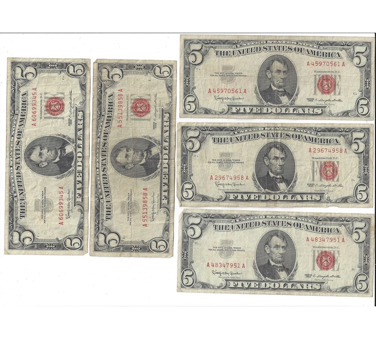 1963 $5 Red Seal Bill Lot of 5.