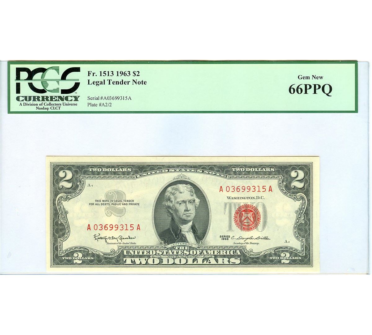 One 1963 PCGS GN66PPQ $2 Red Seal Legal Tender Bank Note.