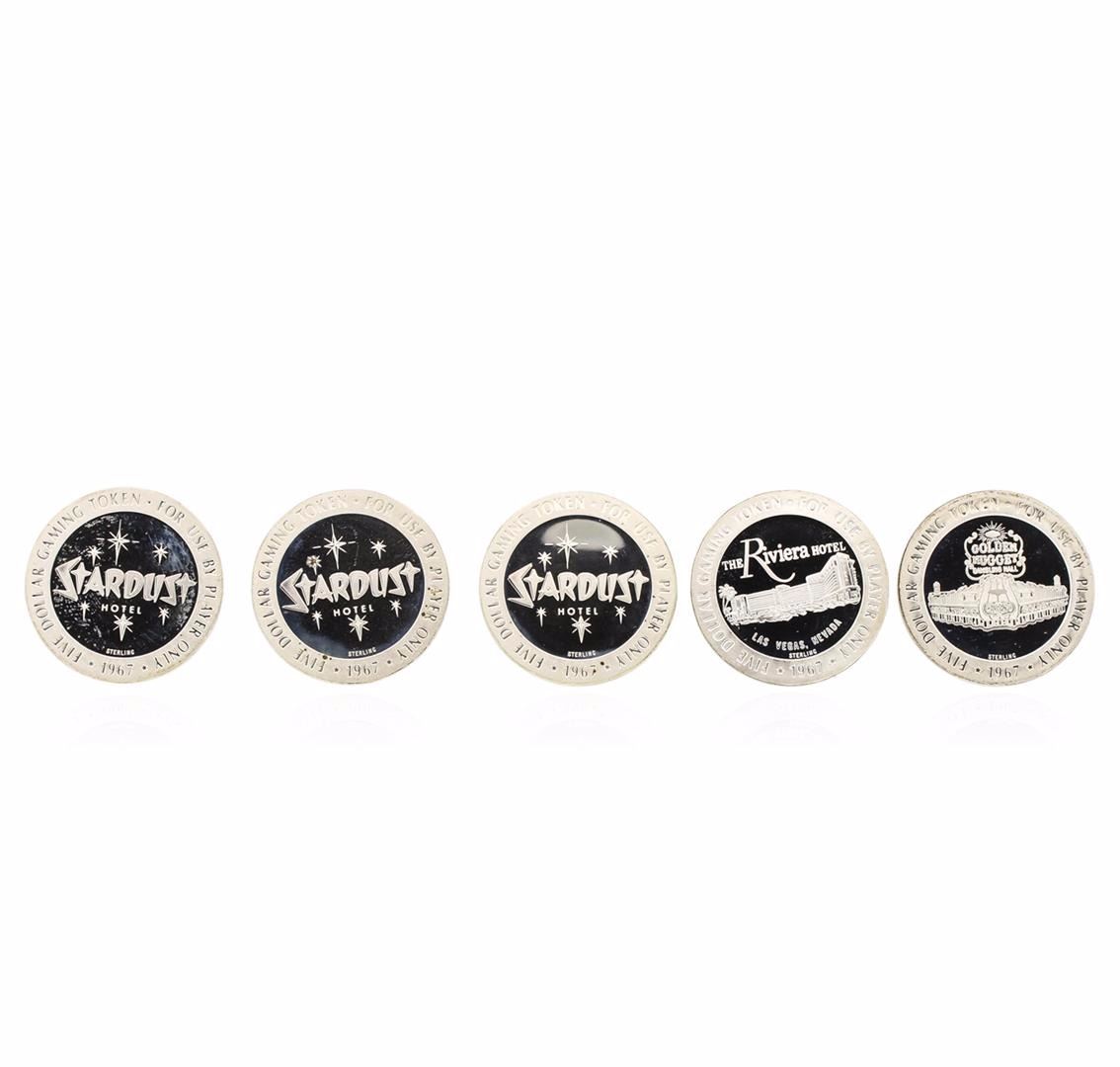 One 1967 $5 Las Vegas Sterling Silver Gaming Token Lot of 5. Pictures represent the lot of 5.