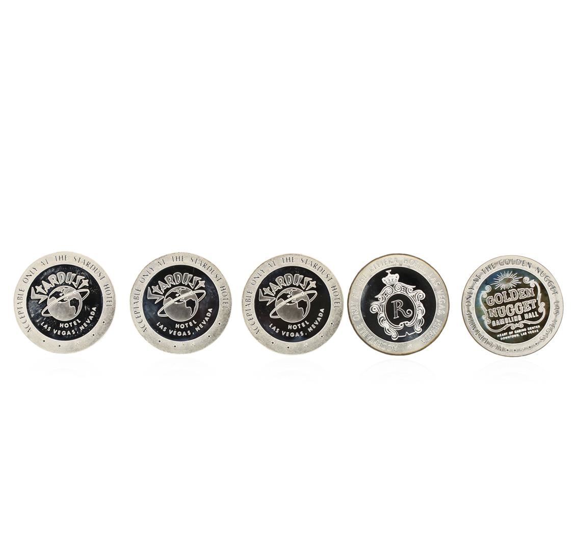 One 1967 $5 Las Vegas Sterling Silver Gaming Token Lot of 5. Pictures represent the lot of 5.