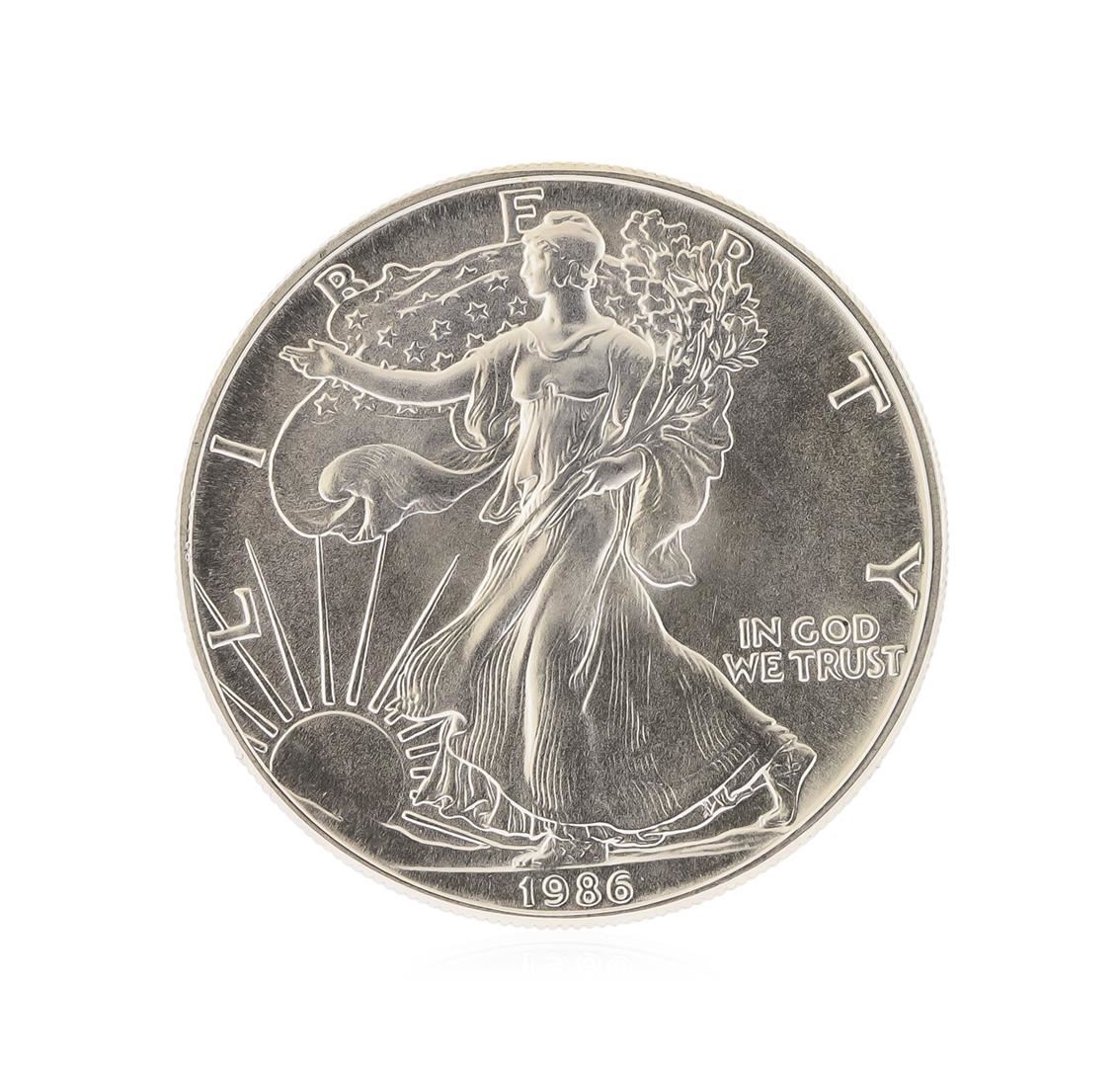 One 1986 American Silver Eagle Dollar Coin.
