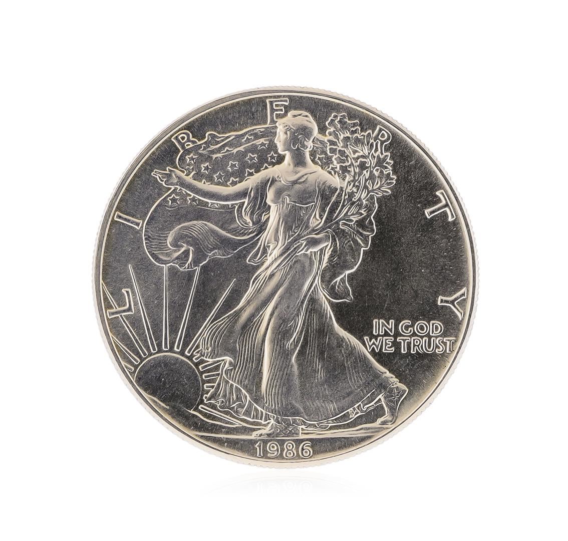 One 1986 American Silver Eagle Dollar Coin.
