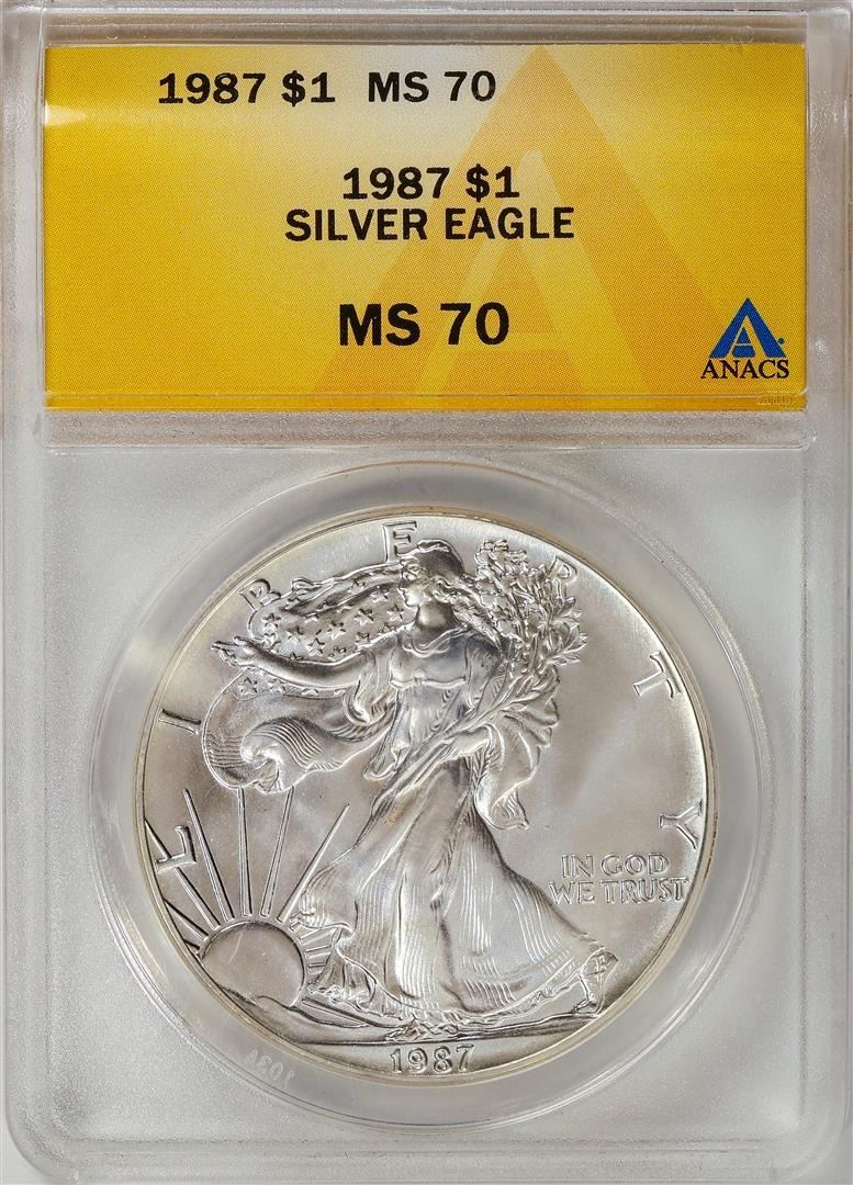 One 1987 American Silver Eagle .999 Fine Silver Dollar Coin ANACS MS70.