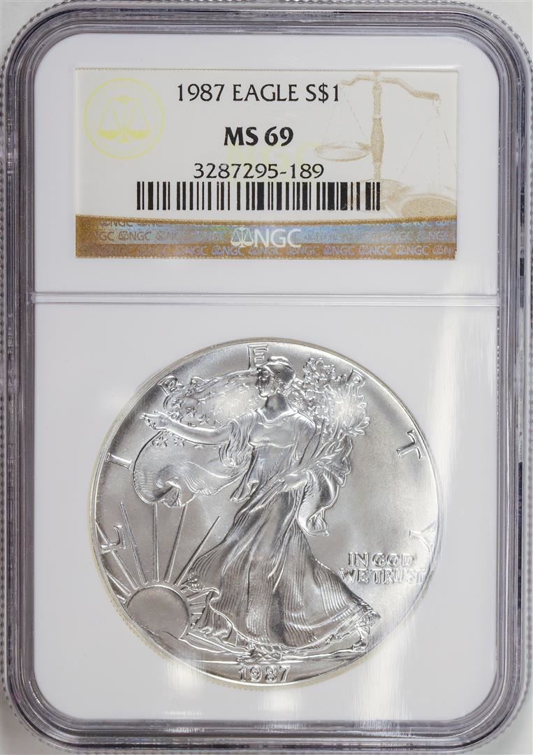 One 1987 American Silver Eagle .999 Fine Silver Dollar Coin NGC MS69.