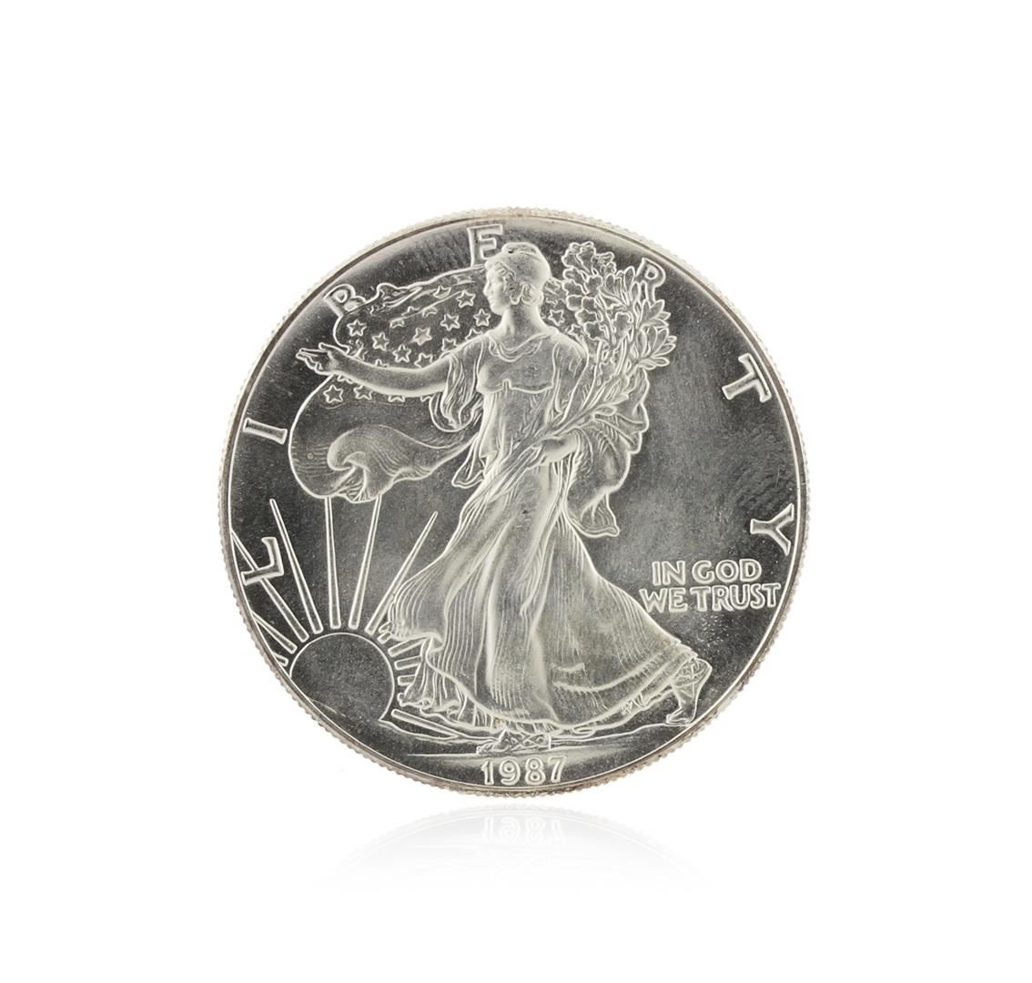 One 1987 American Silver Eagle Dollar BU Coin.
