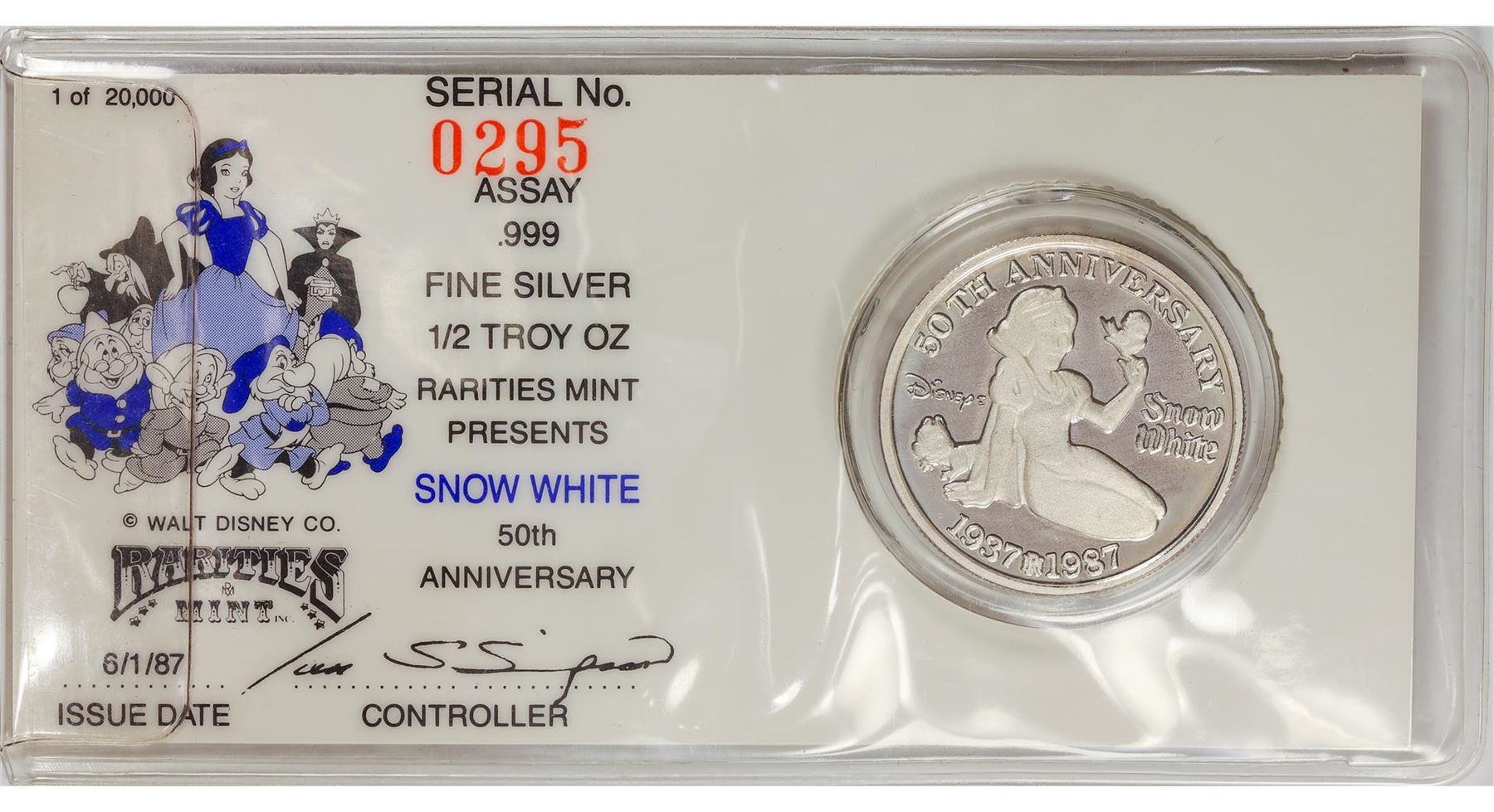One 1987 Snow White 50th Anniversary .999 Fine Silver 1/2 Troy Oz Coin.