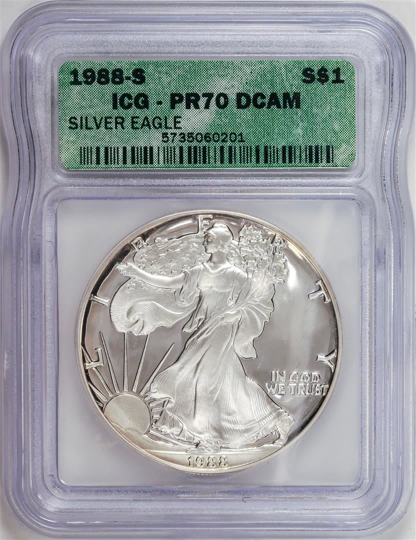 One 1988-S American Silver Eagle .999 Fine Silver Dollar Coin ICG PR70DCAM.