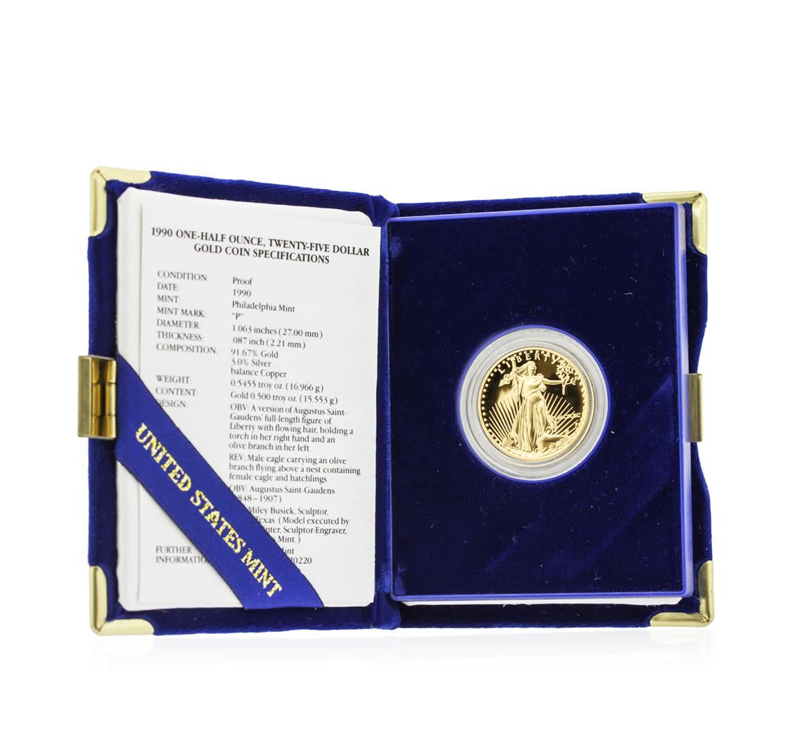 One 1990-P One-Half Ounce $25 Gold Coin. This coin is in PROOF condition and includes original box and papers!