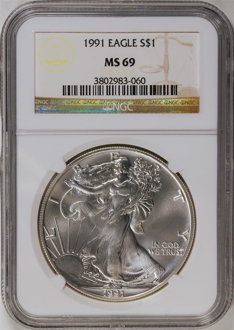 One 1991 American Silver Eagle .999 Fine Silver Dollar Coin NGC MS69.