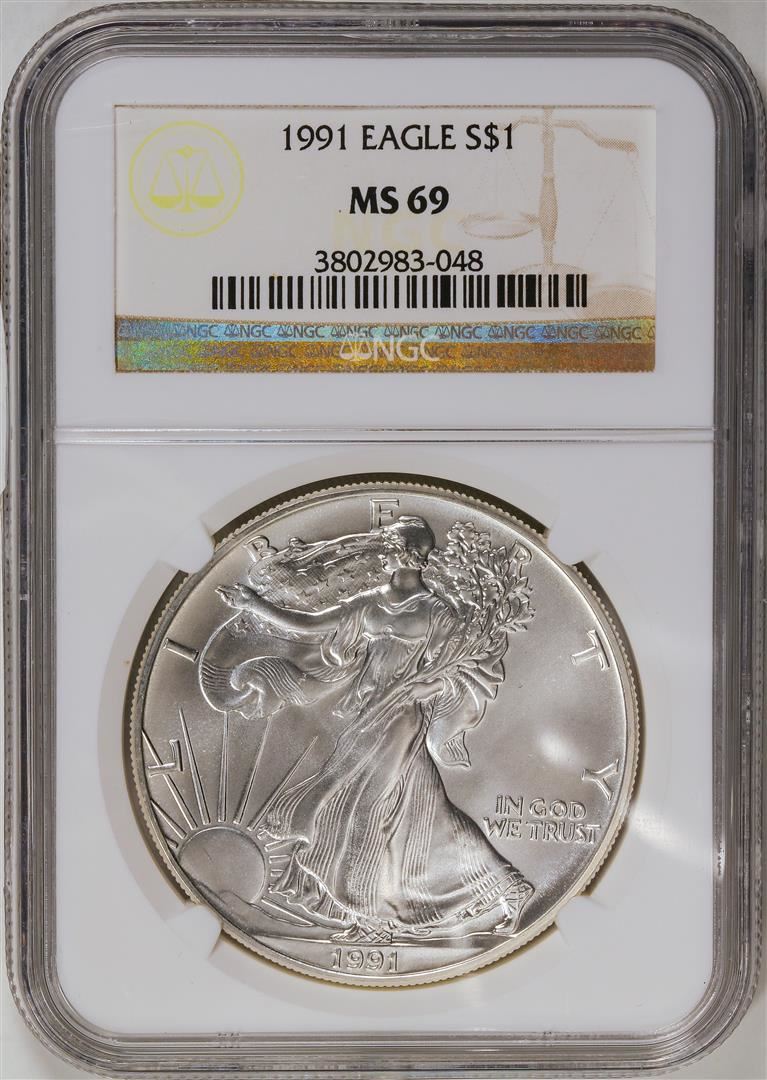 One 1991 American Silver Eagle .999 Fine Silver Dollar Coin NGC MS69.