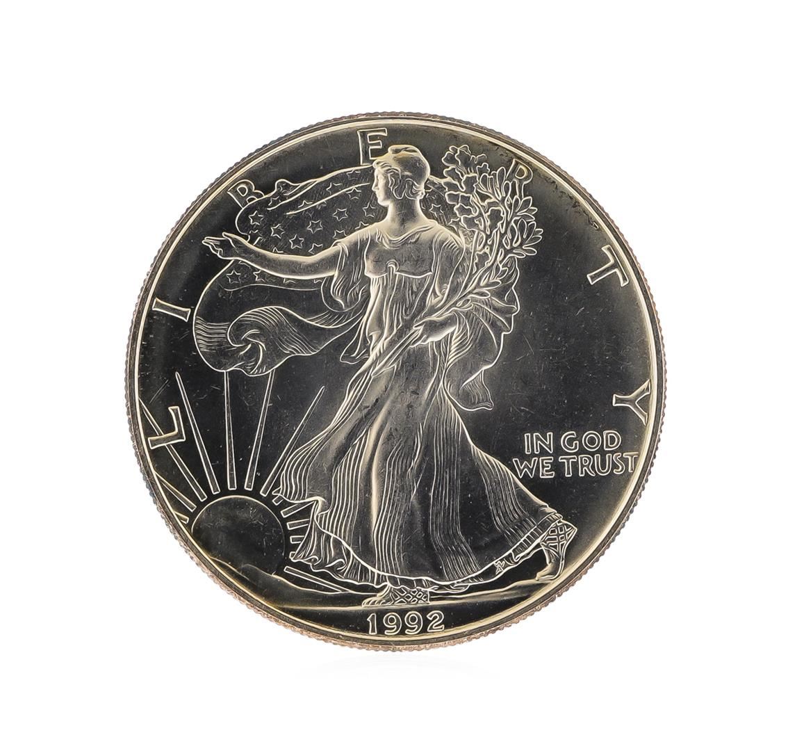One 1992 American Silver Eagle Dollar Coin.