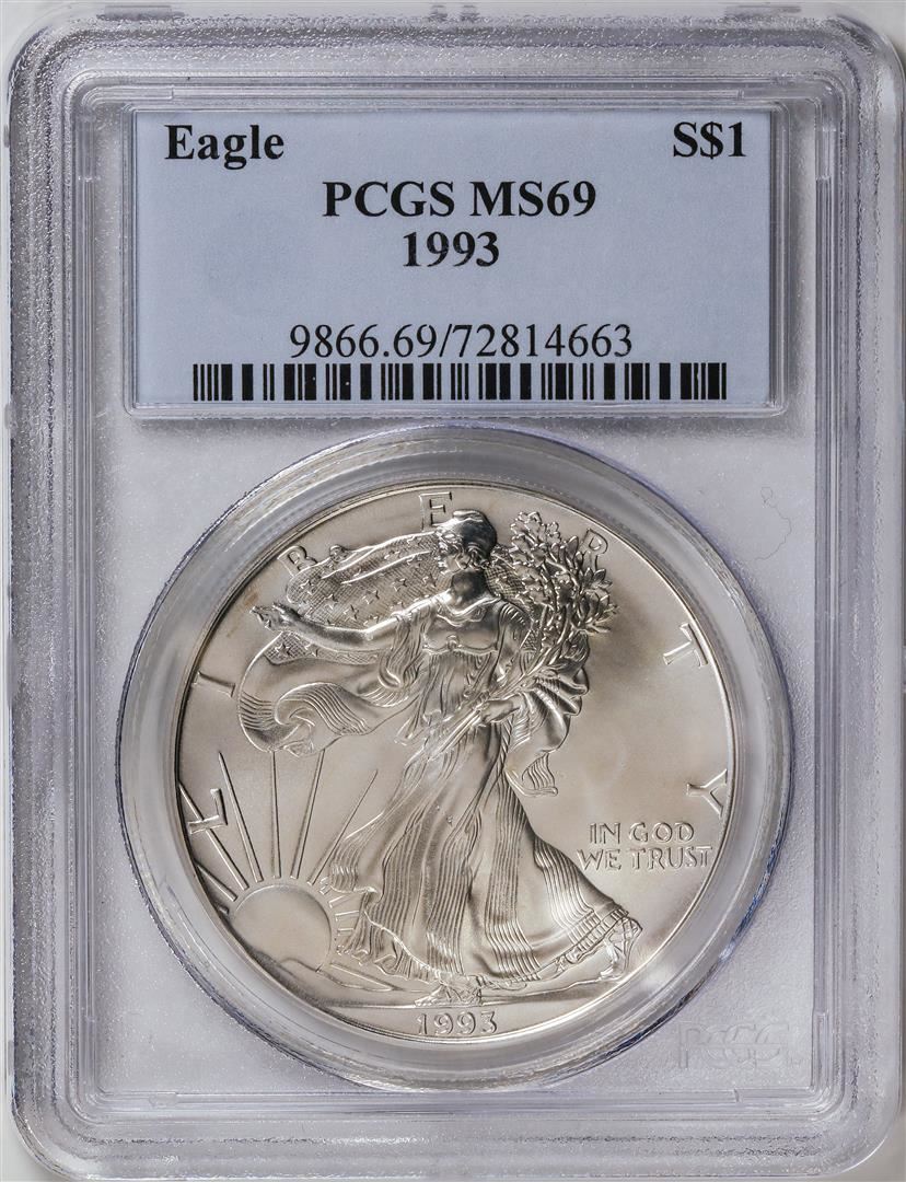 One 1993 American Silver Eagle .999 Fine Silver Dollar Coin PCGS MS69.