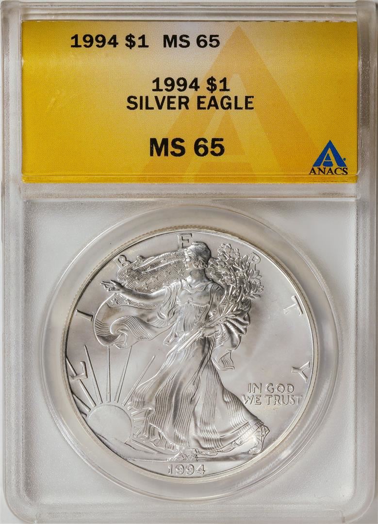 One 1994 American Silver Eagle .999 Fine Silver Dollar Coin ANACS MS65.