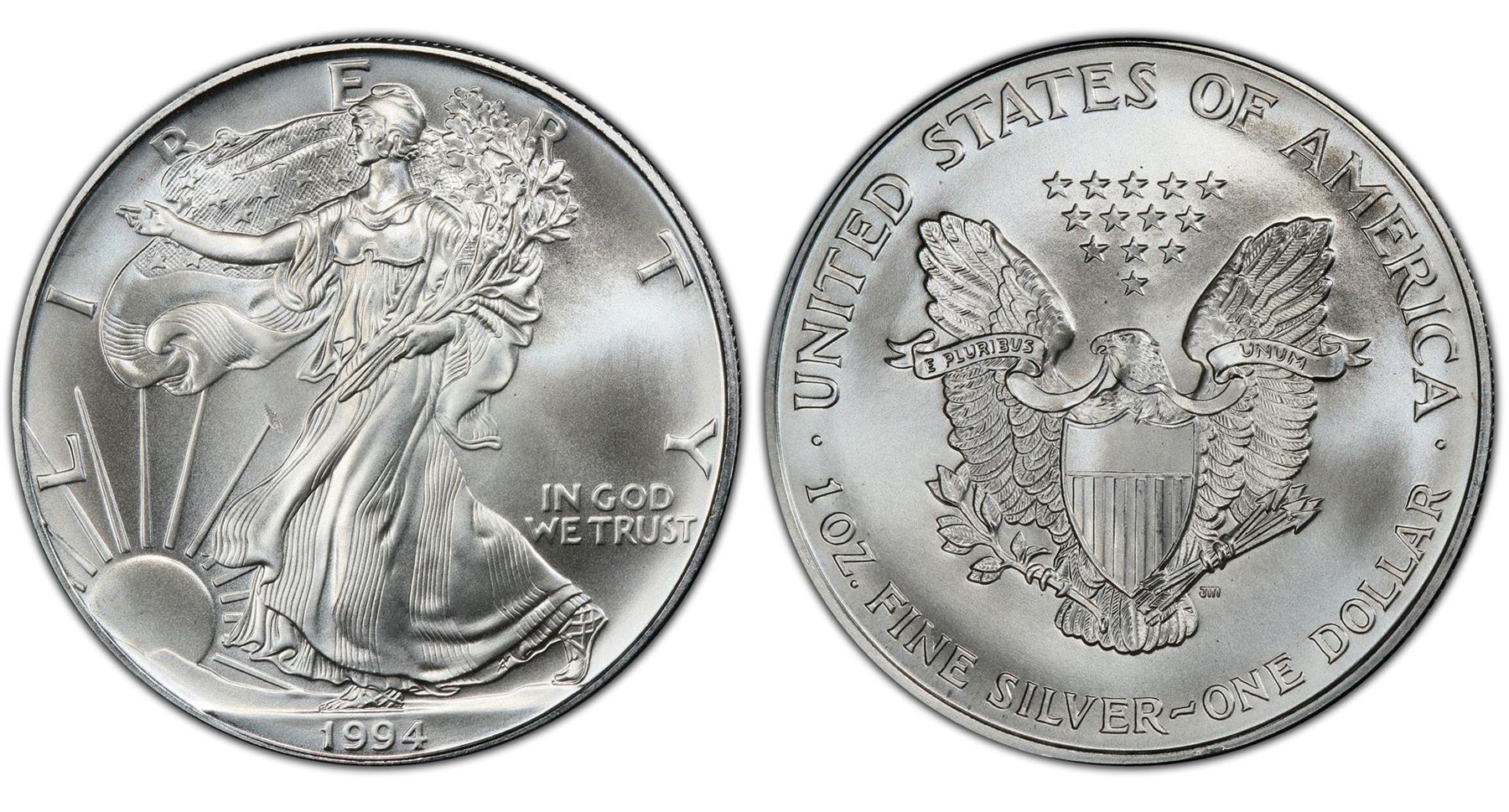 One 1994 American Silver Eagle .999 Fine Silver Dollar Coin. A great addition to any beginner or advanced coin collector's collection!
