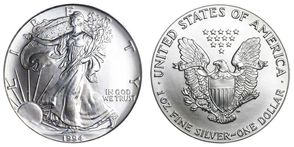 One 1994 American Silver Eagle .999 Fine Silver Dollar Coin.
