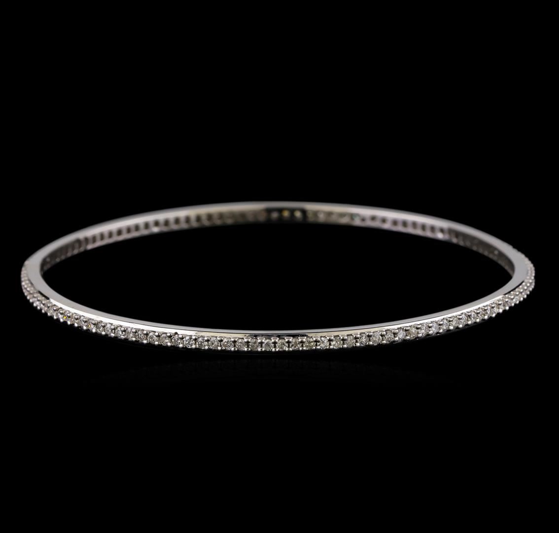 One electronically tested 18KT white gold ladies cast diamond bangle. Seven and three quarter inch wearable length bangle features a rigid diamond ribbon measuring two millimeters wide. Bright polish finish. Condition is good. Containing: One Hundred Twenty-Four prong set round brilliant cut diamonds, measuring 1.60 - 1.60 x 0.96mm (depth est.) approximate total weight of 124 Stones = 2.00ct. Graded in the setting. Clarity: I-2 to I-3. Color: G - I. Total Weight of Diamonds 2.00ct. Total Weight of Bangle 12.94gm. AIG Appraised at $6,535.00.