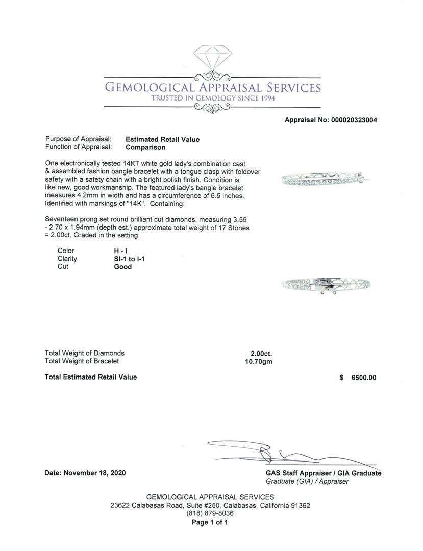 One electronically tested 14KT white gold lady's combination cast & assembled fashion bangle bracelet with a tongue clasp with foldover safety with a safety chain with a bright polish finish. Condition is like new, good workmanship. The featured lady's bangle bracelet measures 4.2mm in width and has a circumference of 6.5 inches. Identified with markings of "14K". Containing: Seventeen prong set round brilliant cut diamonds, measuring 3.55 - 2.70 x 1.94mm (depth est.) approximate total weight of 17 Stones = 2.00ct. Graded in the setting. Color Clarity Cut H-1 SI-1 to 1-1 Good Total Weight of Diamonds Total Weight of Bracelet 2.00ct. 10.70gm Total Estimated Retail Value $ 6500.00