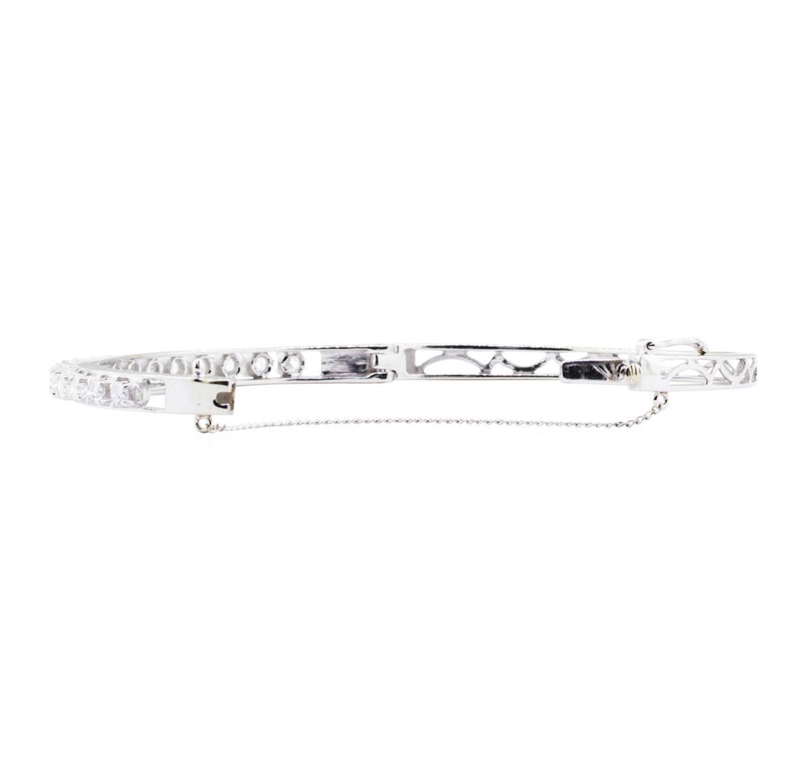 One electronically tested 14KT white gold lady's combination cast & assembled fashion bangle bracelet with a tongue clasp with foldover safety with a safety chain with a bright polish finish. Condition is like new, good workmanship. The featured lady's bangle bracelet measures 4.2mm in width and has a circumference of 6.5 inches. Identified with markings of "14K". Containing: Seventeen prong set round brilliant cut diamonds, measuring 3.55 - 2.70 x 1.94mm (depth est.) approximate total weight of 17 Stones = 2.00ct. Graded in the setting. Color Clarity Cut H-1 SI-1 to 1-1 Good Total Weight of Diamonds Total Weight of Bracelet 2.00ct. 10.70gm Total Estimated Retail Value $ 6500.00