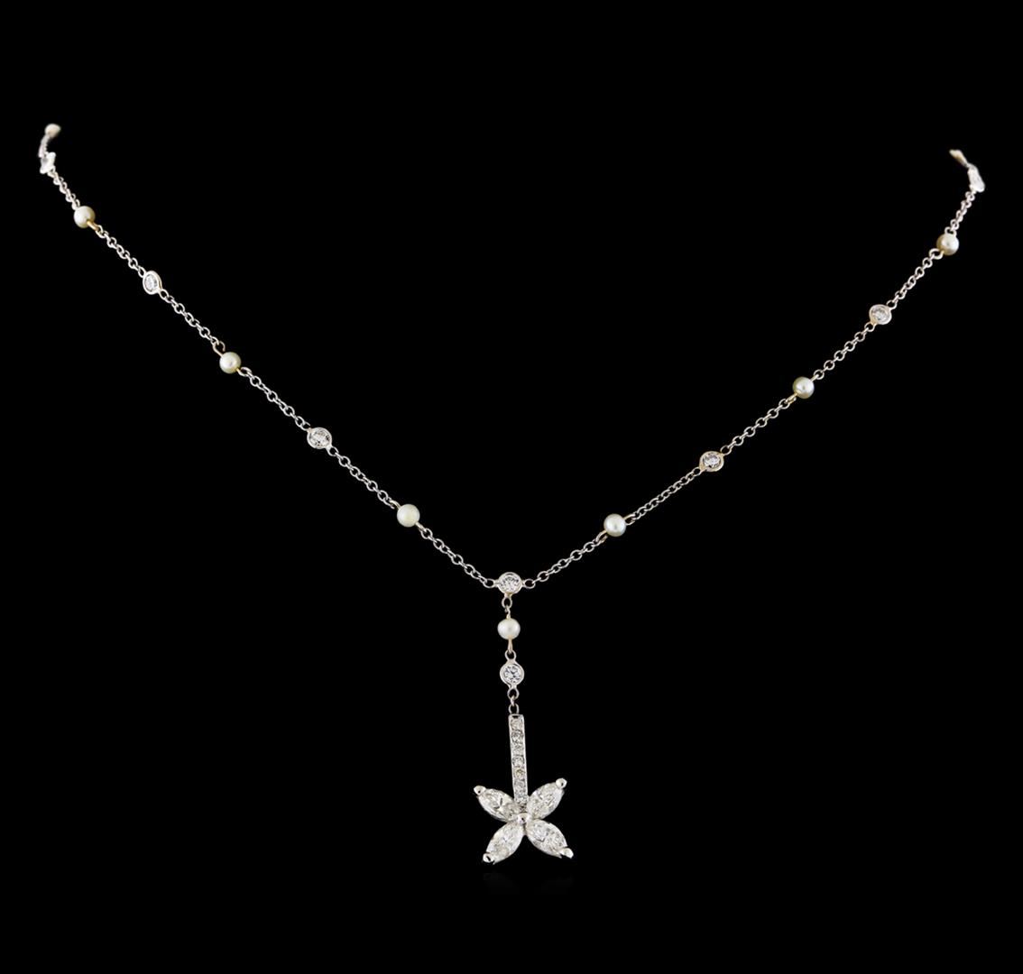 One 14K white gold pendant with 18 inches link chain included. 6.30 GR. Containing: Main gemstones: Identity: Natural diamond. Carat weight and shape: The pendant has 4 marquis shape diamonds and 7 round cut diamonds. The chain has 10 round cut diamonds, bezel settings, plus 11 PCS 3mm white pearls. TW : 2.00 CTS. Quality: SI clarity, G-H color range. all fine cutting and proportions. Total diamonds weight : 2.00 CTS TW. RBGS Appraised at $4,000.00.