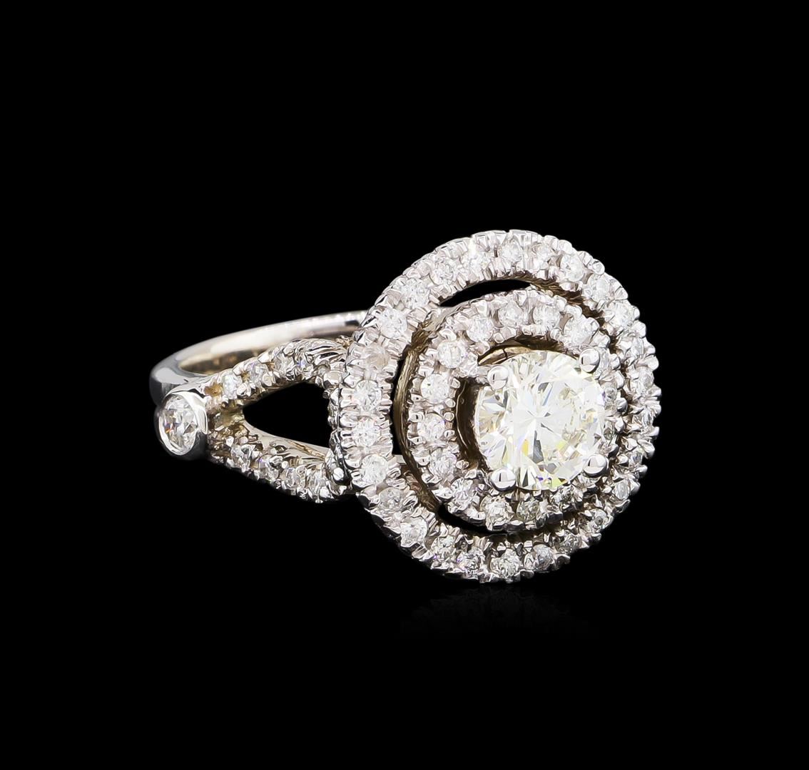 One electronically tested 14KT white gold lady's combination cast & assembled wedding ring with a cathedral shank with a double halo with a bright polish finish. The featured lady's ring has a double shank measuring 3.52 millimeters wide. Identified with markings of "14K". Condition is new, good workmanship. Containing: One prong set round brilliant cut diamond, measuring 6.30 - 6.25 x 3.96mm (depth est.) , 5.00.%. GTCF approximate weight of 1.02ct. EGL Laboratory Report #1502450624. Clarity: SI-1. Color: F. Cut Excellent Two bezel set round brilliant cut diamonds, measuring 2.60 - 2.55 x 1.63mm (depth est.) approximate total weight of 2 Stones = 0.14ct. Graded in the setting. Clarity: SI-2. Color: Good Ninety-Two prong set round brilliant cut diamonds, measuring 1.40 - 1.25 x 0.84mm (depth est.) approximate total weight of 92 Stones = 0.84ct. Graded in the setting. Clarity: SI-1 to I-1. Color: H - I. Cut Good. Total Weight of Diamonds 2.00ct. Total Weight of Ring 8.80gm. GAS Appraised at $20,635.00.