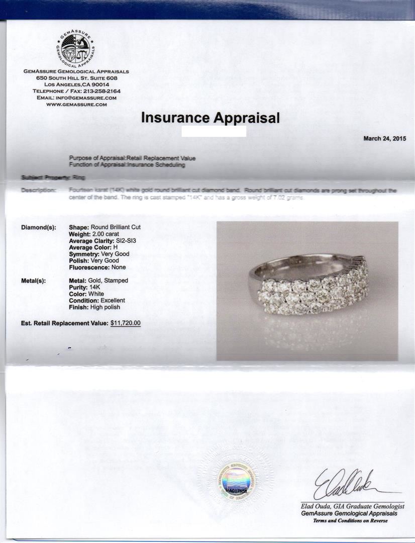 Fourteen karat (14K) white gold round brilliant cut diamond band. Round brilliant cut diamonds are prong set throughout the center of the band. The ring is cast stamped "14K" and has a gross weight of 7.02 grams. Diamond(s): Shape: Round Brilliant Cut. Weight: 2.00 carat. Average Clarity: SI2-SI3. Average Color: H. Symmetry: Very Good. Polish: Very Good. Fluorescence: None. Metal(s): Metal: Gold, Stamped. Purity: 14K. Color: White. Condition: Excellent. Finish: High polish. GGA Appraised at $11,720.00.
