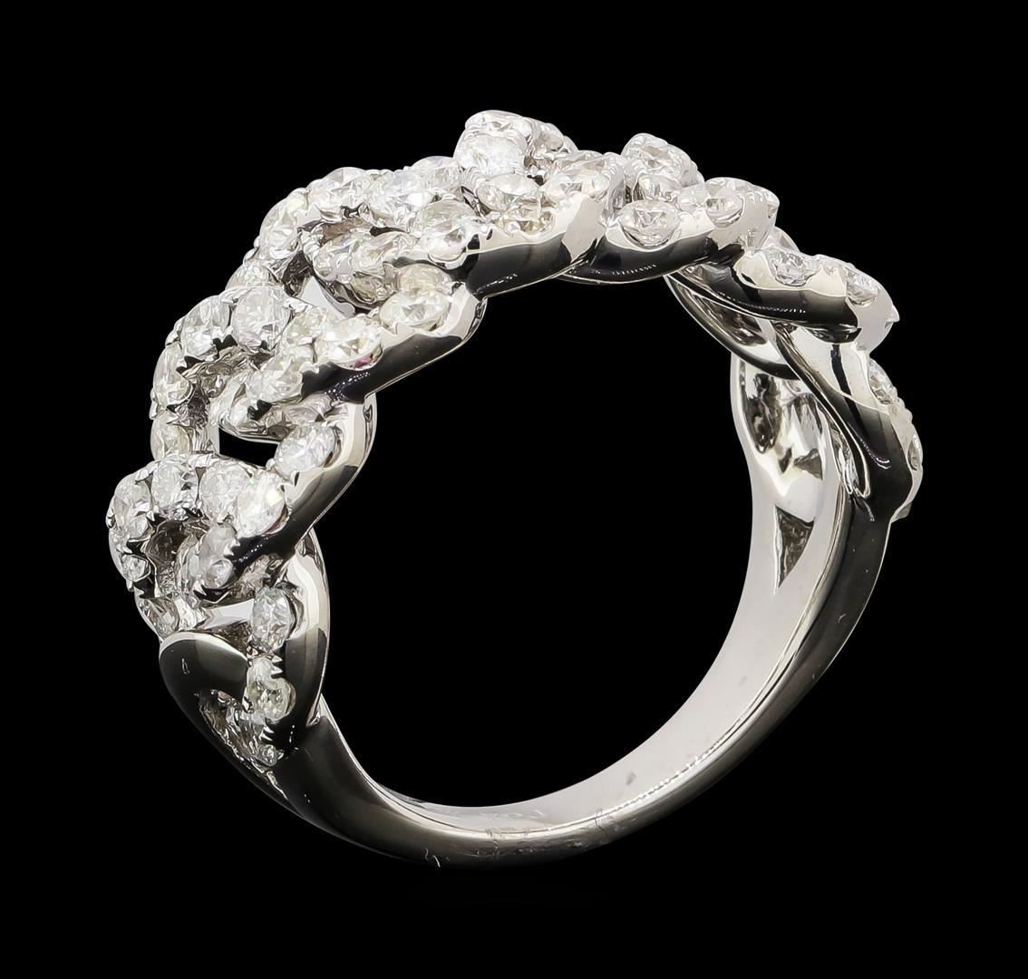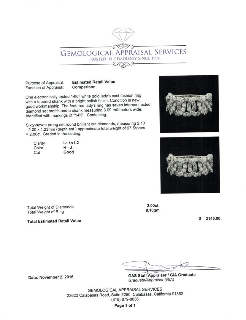 One electronically tested 14KT white gold lady's cast fashion ring with a tapered shank with a bright polish finish. The featured lady's ring has seven interconnected diamond set motifs and a shank measuring 3.09 millimeters wide. Identified with markings of '14K'. Condition is new, good workmanship. Containing: Sixty-Seven prong set round brilliant cut diamonds, measuring 2.10 - 2.00 x 1.23mm (depth est.) approximate total weight of 67 Stones = 2.00ct. Graded in the setting. Clarity I-1 to I-2. Color: H - J Cut Good. Total Weight of Diamonds 2.00ct.. Total Weight of Ring 8.10gm. GAS Appraised at $3,145.00.