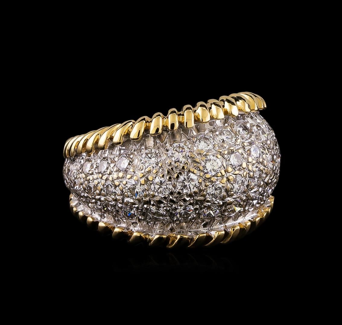 One electronically tested 14KT yellow gold ladies cast diamond cluster ring. The ring features a diamond set curvature set within parallel yellow gold ribbons supported by tapering shoulders, completed by a six millimeter wide band. Bright and patterned finish with rhodium accents. Identified with markings of "14KP". Condition is good. Containing: Fifty-Three pave' set round brilliant cut diamonds, measuring 2.50 - 2.00 x 1.35mm (depth est.) approximate total weight of 53 Stones = 2.00ct. Graded in the setting. Clarity: VS-1 to SI-1. Color: G - H. Total Weight of Diamonds 2.00ct. Total Weight of Ring 12.58gm. AIG Appraised at $9,265.00.