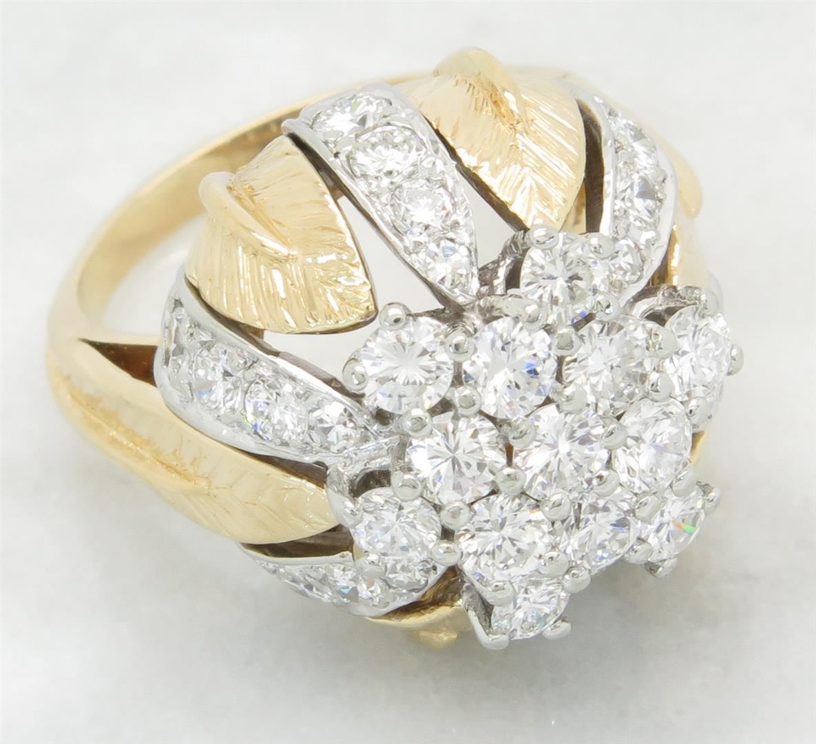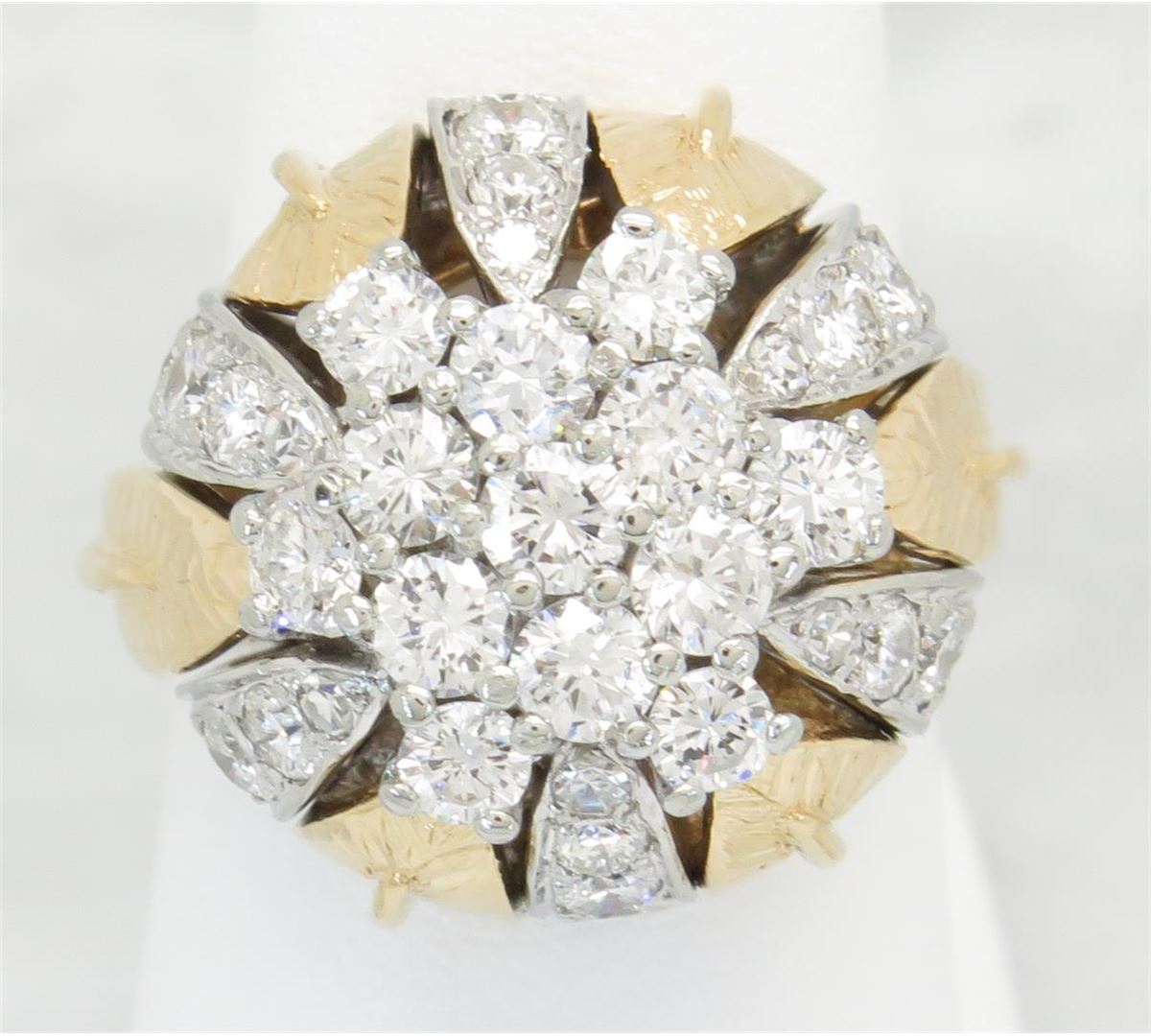 One tested 14K gold diamond ring. Containing: 31 Round Brilliant Cut Diamonds, 6 Single Cut Diamonds. Clarity: SI1-I1, Color: G-I. Approximate total diamond weight: 2.00CTW. All diamonds are graded in the mounting unless otherwise stated. Weight of ring: 10.9 grams, Size: 5.75.
