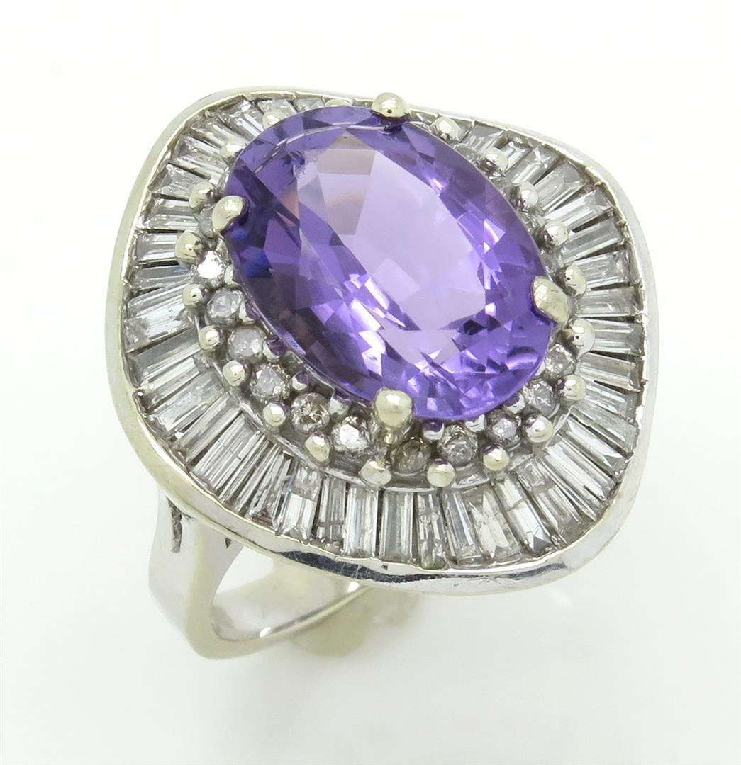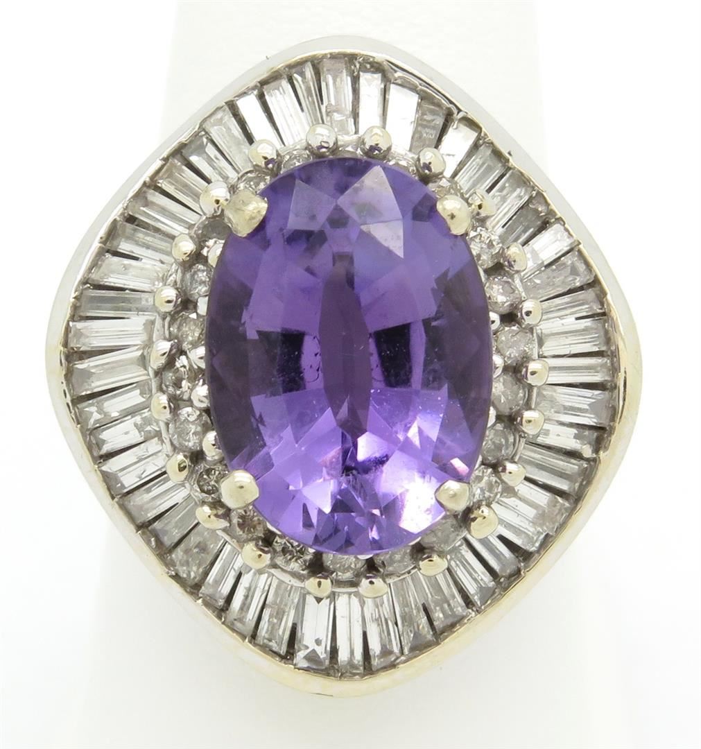 One tested 14K white gold diamond and amethyst ring. Containing: One 14.04MM X 10.18MM purple amethyst. 46 Baguette Cut Diamonds, 22 Round Brilliant Cut Diamonds. Clarity: I-SI, Color: G-I. Approximate total diamond weight: 2CTW. Diamonds are graded in the mounting, unless otherwise stated. Weight of ring: 11.8 grams. Size: 7.0
