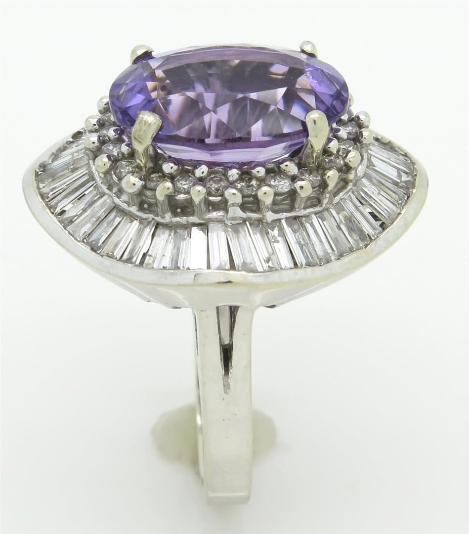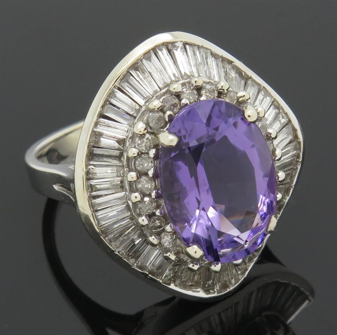 One tested 14K white gold diamond and amethyst ring. Containing: One 14.04MM X 10.18MM purple amethyst. 46 Baguette Cut Diamonds, 22 Round Brilliant Cut Diamonds. Clarity: I-SI, Color: G-I. Approximate total diamond weight: 2CTW. Diamonds are graded in the mounting, unless otherwise stated. Weight of ring: 11.8 grams. Size: 7.0