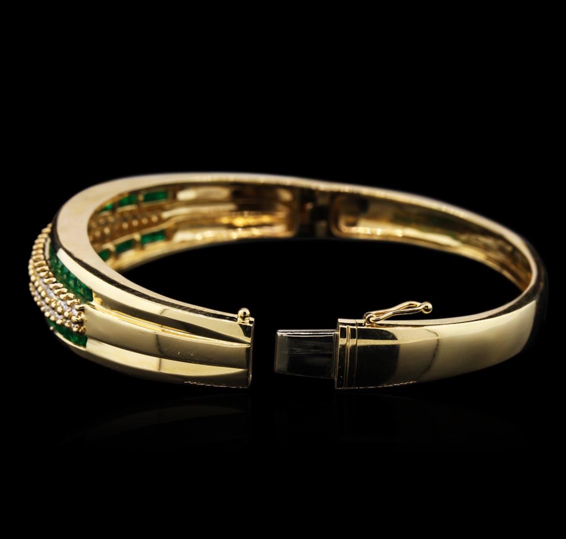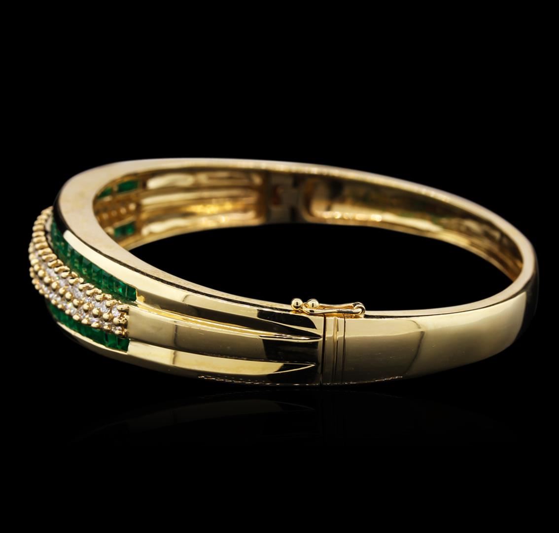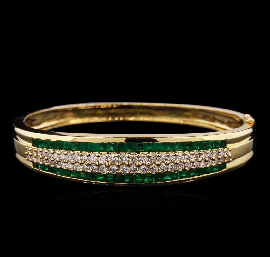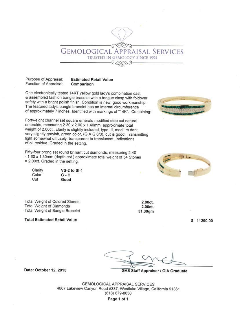 One electronically tested 14KT yellow gold lady's combination cast & assembled fashion bangle bracelet with a tongue clasp with fold over safety with a bright polish finish. The featured lady's bangle bracelet has an internal circumference of approximately 7 inches. Identified with markings of "14K". Condition is new, good workmanship. Containing: Forty-eight channel set square emerald modified step cut natural emeralds, measuring 2.30 x 2.00 x 1.40mm, approximate total weight of 2.00ct., clarity is slightly included, type III, medium dark, very slightly grayish, green color, (GIA G 6/3), cut is good. Transmitting light somewhat diffusely, transparent to translucent. Indications of oil residue. Graded in the setting. Fifty-Four prong set round brilliant cut diamonds, measuring 2.40 - 1.60 x 1.30mm (depth est.) approximate total weight of 54 Stones = 2.00ct. Graded in the setting. Clarity: VS-2 to SI-1. Color: G - Good. Total Weight of Colored Stones 2.00ct. Total Weight of Diamonds 2.00ct. Total Weight of Bangle Bracelet 31.30gm. GAS Appraised at $11,290.00.