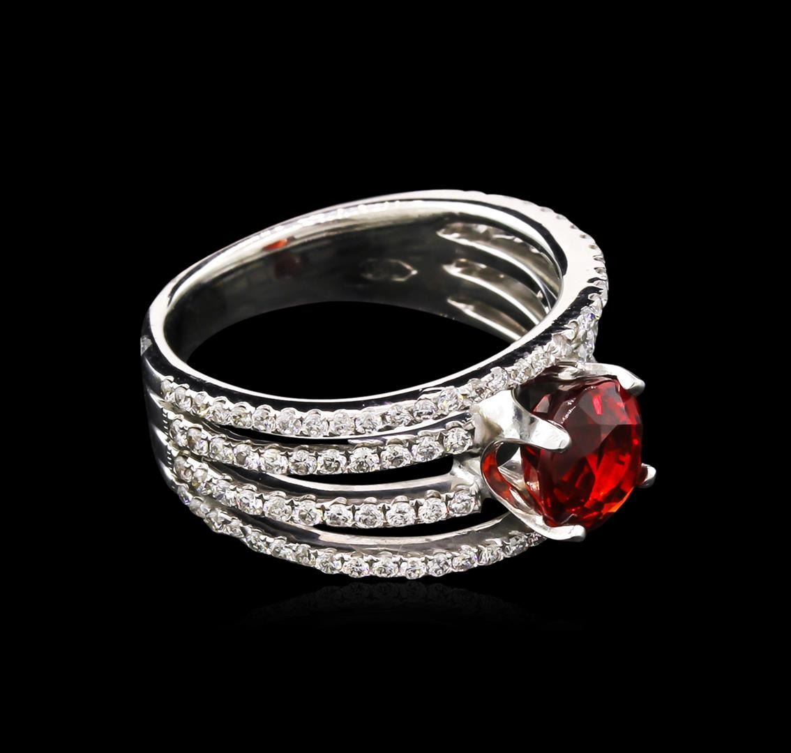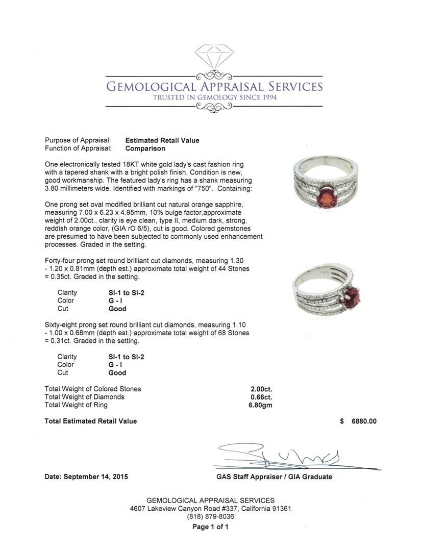 One electronically tested 18KT white gold lady's cast fashion ring with a tapered shank with a bright polish finish. The featured lady's ring has a shank measuring 3.80 millimeters wide. Identified with markings of "750". Condition is new, good workmanship. Containing: One prong set oval modified brilliant cut natural orange sapphire, measuring 7.00 x 6.23 x 4.95mm, 10% bulge factor, approximate weight of 2.00ct., clarity is eye clean, type II, medium dark, strong, reddish orange color, (GIA rO 6/5), cut is good. Colored gemstones are presumed to have been subjected to commonly used enhancement processes. Graded in the setting. Forty-Four prong set round brilliant cut diamonds, measuring 1.30 - 1.20 x 0.81mm (depth est.) approximate total weight of 44 Stones = 0.35ct. Graded in the setting. Clarity: SI-1 to SI-2. Color: G - I. Cut Good Sixty-Eight prong set round brilliant cut diamonds, measuring 1.10 - 1.00 x 0.68mm (depth est.) approximate total weight of 68 Stones = 0.31ct. Graded in the setting. Clarity: SI-1 to SI-2. Color: G - I. Cut Good. Total Weight of Colored Stones 2.00ct. Total Weight of Diamonds 0.66ct. Total Weight of Ring 6.80gm. GAS Appraised at $6,880.00.