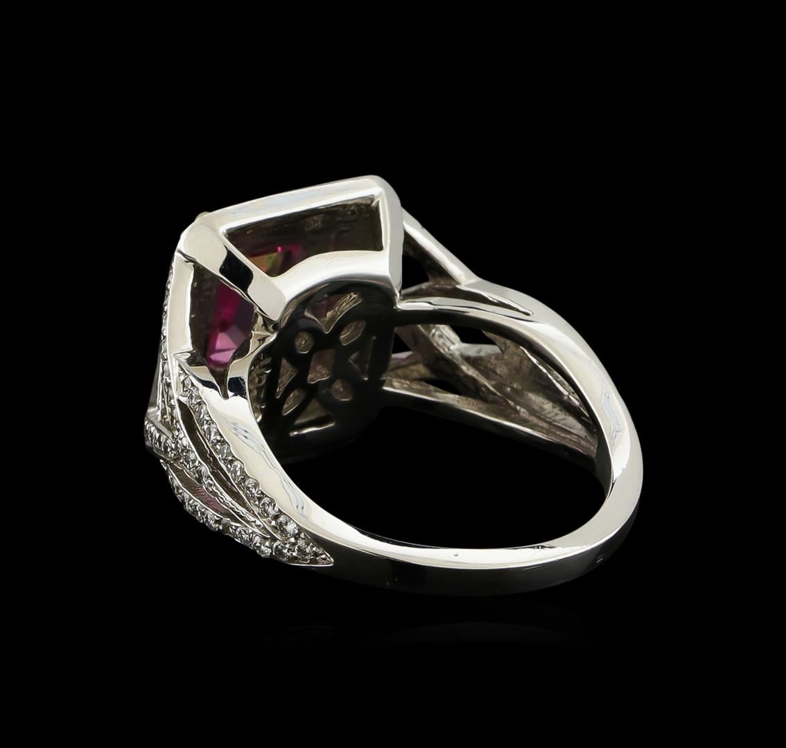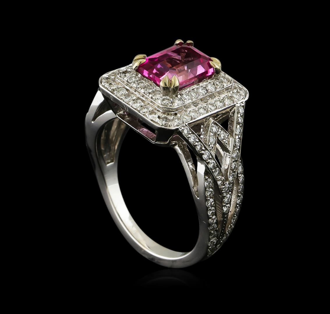 One electronically tested 14KT white gold lady's cast fashion ring with a split shank double basket halo with a bright polish finish. The featured lady's ring has a shank measuring 2.00 millimeters wide. Identified with markings of "14K". Condition is new, good workmanship. Containing: One prong set emerald step cut natural pink tourmaline, measuring 7.95 x 5.95 x 4.31mm, 15%. bulge factor, approximate weight of 2.00ct., clarity is eye clean, type II, medium, moderately strong, strongly purplish red color, (GIA stpR 5/4), cut is very good. Transmitting light with no distortion, transparent. Colored gemstones are presumed to have been subjected to commonly used enhancement processes. Graded in the setting. One Hundred Thirty-Four prong set round brilliant cut diamonds, measuring 1.20 - 1.15 x 0.72mm (depth est.) approximate total weight of 134 Stones = 0.81ct. Graded in the setting. Clarity: VS-1 to SI-1. Color: G - Very Good. Total Weight of Colored Stones 2.00ct. Total Weight of Diamonds 0.81ct. Total Weight of Ring 6.60gm GAS Appraised at $5,850.00.