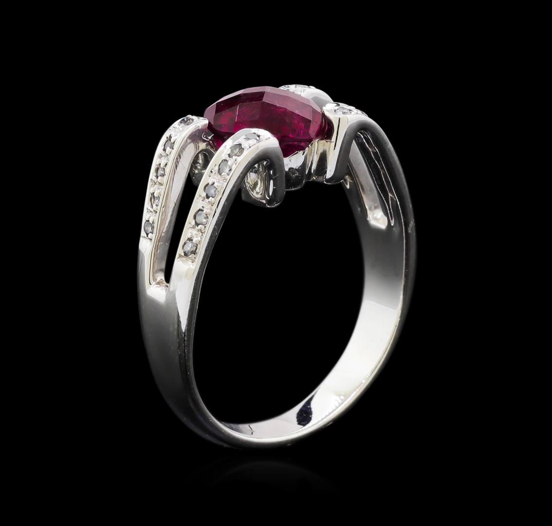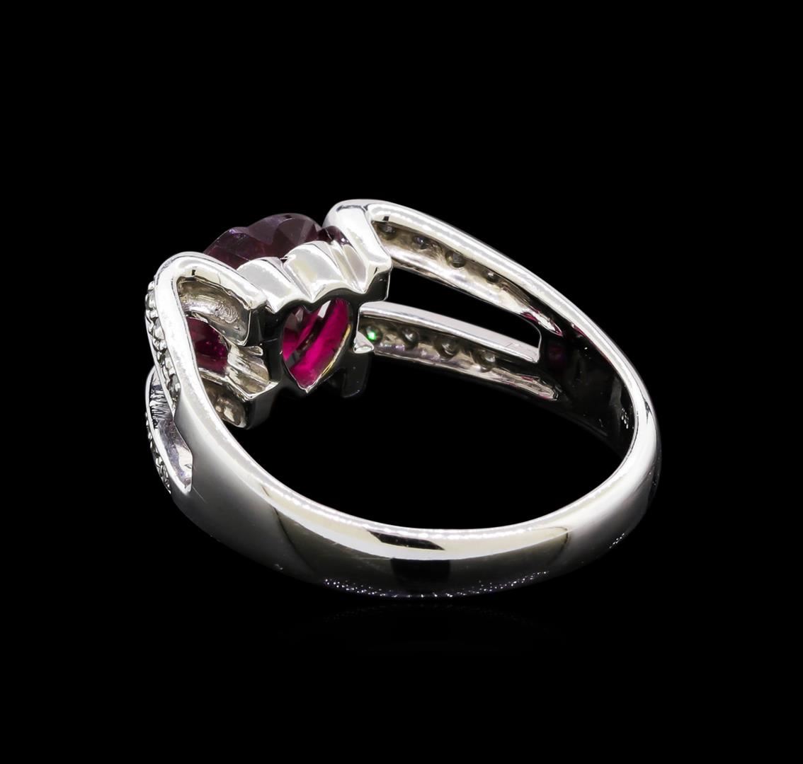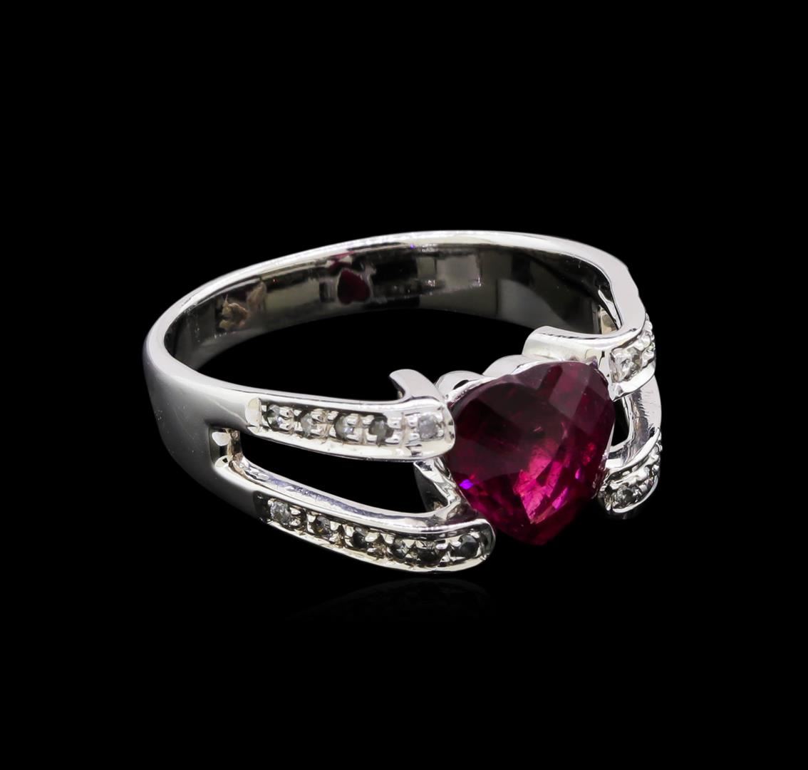 One electronically tested 18KT white gold lady's cast fashion ring with a split shank with a bright polish finish. The featured lady's ring has a shank measuring 3.32 millimeters wide. Identified with markings of "750". Condition is new, good workmanship. Containing: One prong set heart cut natural rubellite, measuring 8.04 x 7.90 x 5.27mm, approximate weight of 2.00ct., clarity is moderately included, type III, medium dark, moderately strong, orangy red color, (GIA oR 6/4), cut is very good. The featured Rubellite has a checkerboard faceted crown. Transmitting light somewhat diffusely, transparent to translucent. Colored gemstones are presumed to have been subjected to commonly used enhancement processes. Graded in the setting. Twenty-Two prong set round brilliant cut diamonds, measuring 1.20 - 1.10 x 0.71mm (depth est.) approximate total weight of 22 Stones = 0.12ct. Graded in the setting. Clarity: SI-1 to SI-2. Color: H - I. Cut Good. Total Weight of Colored Stones 2.00ct. Total Weight of Diamonds 0.12ct. Total Weight of Ring 5.70gm. GAS Appraised at $2,525.00.