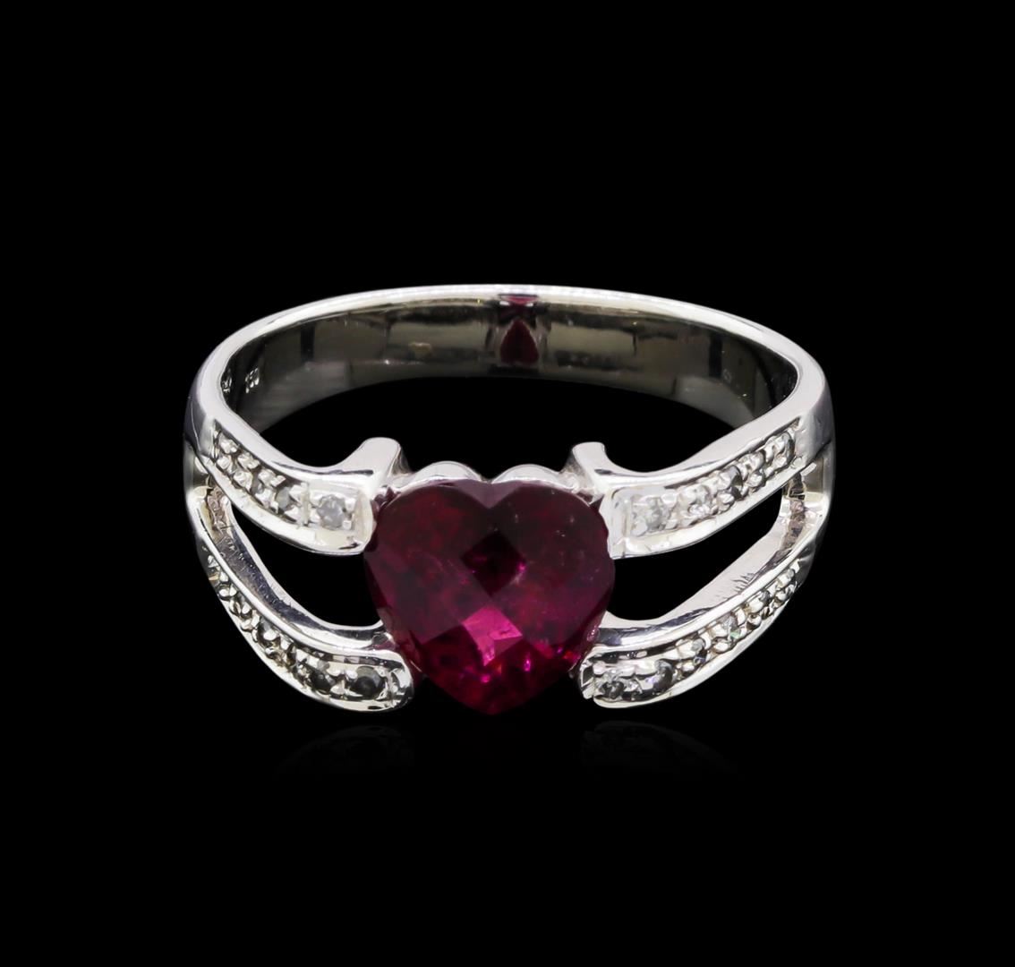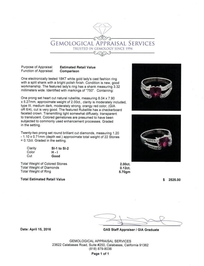 One electronically tested 18KT white gold lady's cast fashion ring with a split shank with a bright polish finish. The featured lady's ring has a shank measuring 3.32 millimeters wide. Identified with markings of "750". Condition is new, good workmanship. Containing: One prong set heart cut natural rubellite, measuring 8.04 x 7.90 x 5.27mm, approximate weight of 2.00ct., clarity is moderately included, type III, medium dark, moderately strong, orangy red color, (GIA oR 6/4), cut is very good. The featured Rubellite has a checkerboard faceted crown. Transmitting light somewhat diffusely, transparent to translucent. Colored gemstones are presumed to have been subjected to commonly used enhancement processes. Graded in the setting. Twenty-Two prong set round brilliant cut diamonds, measuring 1.20 - 1.10 x 0.71mm (depth est.) approximate total weight of 22 Stones = 0.12ct. Graded in the setting. Clarity: SI-1 to SI-2. Color: H - I. Cut Good. Total Weight of Colored Stones 2.00ct. Total Weight of Diamonds 0.12ct. Total Weight of Ring 5.70gm. GAS Appraised at $2,525.00.