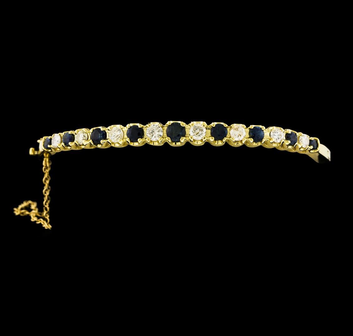 One electronically tested 14KT yellow gold lady's combination cast & assembled fashion bangle bracelet with a tongue clasp with foldover safety with a bright polish finish. The featured lady's bracelet has an attached safety chain and measures approximately 7.25 inches in length. Identified with markings of '14K'. Condition is used, good workmanship. Containing: Nine prong set round modified brilliant cut natural blue sapphires, measuring 4.00 - 2.50 x 2.05 mm, (depth est.) approximate total weight of 2.00ct., clarity is slightly included, medium dark, moderately strong, blue color, (GIA B 6/4), cut is good. Transmitting light with a minimum of distortion, transparent. Colored gemstones are presumed to have been subjected to commonly used enhancement processes. Graded in the setting. Eight prong set round brilliant cut diamonds, measuring 3.50 - 3.00 x 2.02mm (depth est.) approximate total weight of 8 Stones = 1.00ct. Graded in the setting. Clarity SI-1 to I-1. Color: G - H Cut Good. Total Weight of Colored Stones 2.00ct.. Total Weight of Diamonds 1.00ct.. Total Weight of Bangle Bracelet 17.80gm. GAS Appraised at $6,595.00.