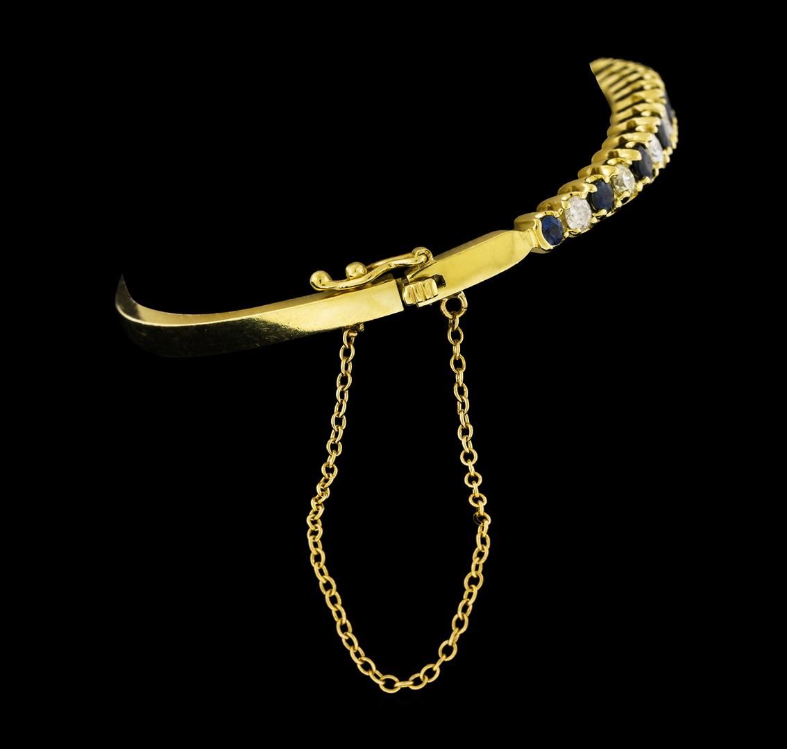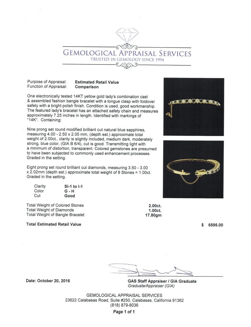 One electronically tested 14KT yellow gold lady's combination cast & assembled fashion bangle bracelet with a tongue clasp with foldover safety with a bright polish finish. The featured lady's bracelet has an attached safety chain and measures approximately 7.25 inches in length. Identified with markings of '14K'. Condition is used, good workmanship. Containing: Nine prong set round modified brilliant cut natural blue sapphires, measuring 4.00 - 2.50 x 2.05 mm, (depth est.) approximate total weight of 2.00ct., clarity is slightly included, medium dark, moderately strong, blue color, (GIA B 6/4), cut is good. Transmitting light with a minimum of distortion, transparent. Colored gemstones are presumed to have been subjected to commonly used enhancement processes. Graded in the setting. Eight prong set round brilliant cut diamonds, measuring 3.50 - 3.00 x 2.02mm (depth est.) approximate total weight of 8 Stones = 1.00ct. Graded in the setting. Clarity SI-1 to I-1. Color: G - H Cut Good. Total Weight of Colored Stones 2.00ct.. Total Weight of Diamonds 1.00ct.. Total Weight of Bangle Bracelet 17.80gm. GAS Appraised at $6,595.00.