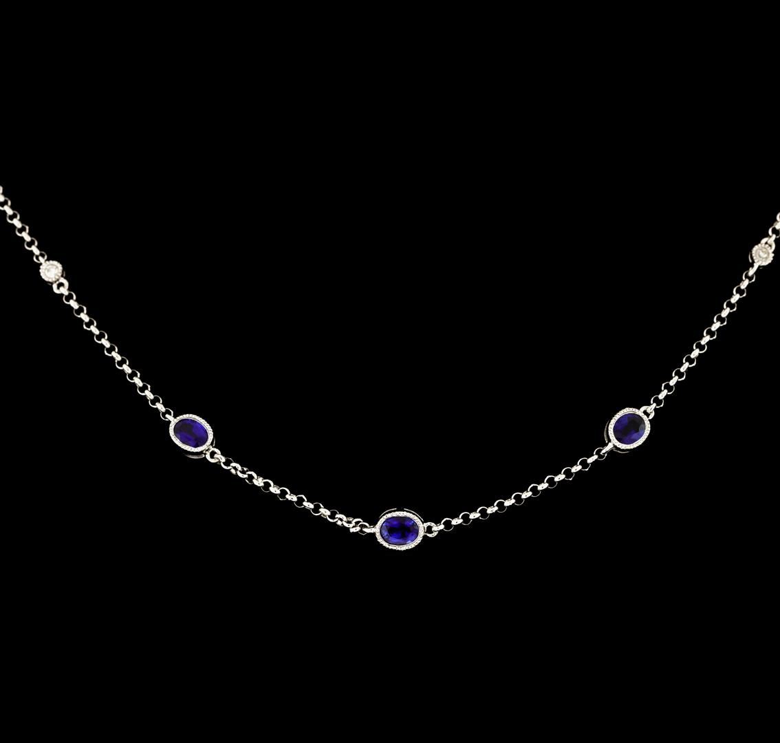 One electronically tested 18KT white gold lady's combination cast & assembled diamonds by the yard necklace with a lobster claw clasp with a bright polish with milgrain detailing finish. The featured lady's necklace has a 1.60mm thick round cable link chain that can be worn between sixteen and approximately seventeen and a half inches in length. Identified with markings of '18K 750'. Condition is new, good workmanship. Containing: Nine bezel set oval modified mixed cut natural blue sapphires, measuring 4.20 x 3.10 x 1.95mm, (depth est.) approximate total weight of 2.00ct., clarity is eye clean, medium dark, moderately strong, blue color, (GIA B 6/4), cut is good. Transmitting light with no distortion, transparent. Colored gemstones are presumed to have been subjected to commonly used enhancement processes. Graded in the setting. Four bezel set single cut diamonds, measuring 1.70 - 1.60 x 1.02mm (depth est.) approximate total weight of 4 Stones = 0.08ct. Graded in the setting. Clarity SI-1 to SI-2. Color: H - I Cut Good. Total Weight of Colored Stones 2.00ct.. Total Weight of Diamonds 0.08ct.. Total Weight of Necklace 6.00gm. GAS Appraised at $3,165.00.