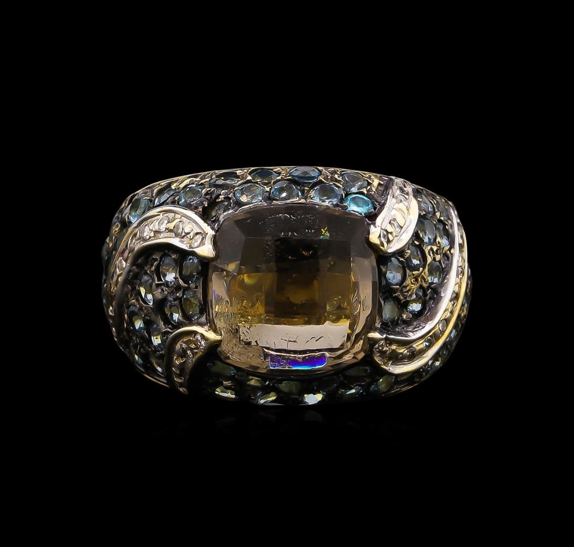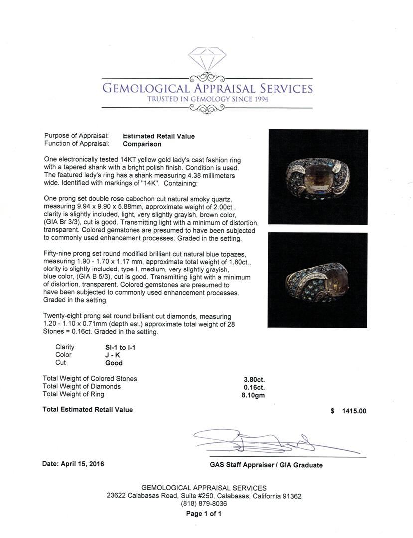 One electronically tested 14KT yellow gold lady's cast fashion ring with a tapered shank with a bright polish finish. The featured lady's ring has a shank measuring 4.38 millimeters wide. Identified with markings of "14K". Condition is used. Containing: One prong set double rose cabochon cut natural smoky quartz, measuring 9.94 x 9.90 x 5.88mm, approximate weight of 2.00ct., clarity is slightly included, light, very slightly grayish, brown color, (GIA Br 3/3), cut is good. Transmitting light with a minimum of distortion, transparent. Colored gemstones are presumed to have been subjected to commonly used enhancement processes. Graded in the setting. Fifty-nine prong set round modified brilliant cut natural blue topazes, measuring 1.90 - 1.70 x 1.17 mm, approximate total weight of 1.80ct., clarity is slightly included, type I, medium, very slightly grayish, blue color, (GIA B 5/3), cut is good. Transmitting light with a minimum of distortion, transparent. Colored gemstones are presumed to have been subjected to commonly used enhancement processes. Graded in the setting. Twenty-Eight prong set round brilliant cut diamonds, measuring 1.20 - 1.10 x 0.71mm (depth est.) approximate total weight of 28 Stones = 0.16ct. Graded in the setting. Clarity: SI-1 to I-1. Color: J - K. Cut Good. Total Weight of Colored Stones 3.80ct. Total Weight of Diamonds 0.16ct. Total Weight of Ring 8.10gm. GAS Appraised at $1,415.00.