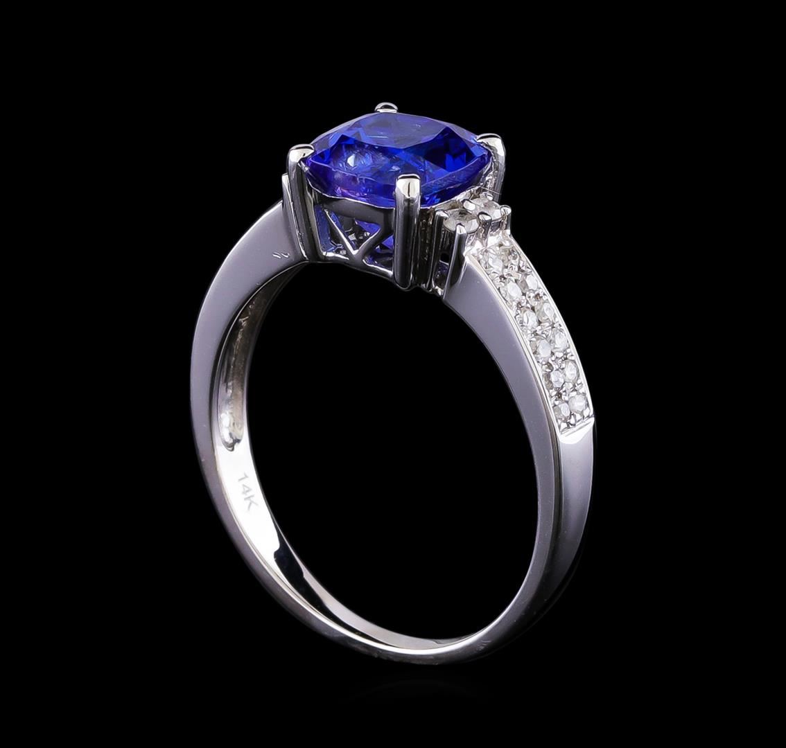 One electronically tested 14KT white gold ladies cast tanzanite and diamond ring with a bright polish finish. The featured tanzanite is supported by diamond set shoulders, completed by a one and one-half millimeter wide band. Trademark is Orianne. Identified with markings of "14K". Condition is new, good workmanship. Containing: One prong set square cushion mixed cut natural tanzanite approximate weight of 2.00ct., clarity is slightly included, type I, medium dark, very slightly grayish, violetish blue color, (GIA vB 6/3), cut is good. Transmitting light with a minimum of distortion, transparent. Naturally occurring internal & external characteristics are present. Graded in the setting. Tanzanite is a very rare gemstone that is only found in the country of Tanzania. Originally discovered in 1967. Tiffany & Company, named the stone Tanzanite. It is found in the Usumburu Mountains that border the Umba Valley of northern Tanzania. Tanzanite occurs in gray, brown, violet, blue, reddish-purple, & green. The gem is interesting because of its exceptional pleochroism. Rotated in different directions a tanzanite will exhibit multiple changes of color. Tanzanite has a low tolerance to ultra. Twenty-Eight prong set round brilliant cut diamonds approximate total weight of 28 Stones = 0.22ct. Graded in the setting. Clarity: I-2 to I-3. Color: H - J. Total Weight of Colored Stones 2.00ct. Total Weight of Diamonds 0.22ct. Total Weight of Ring 3.10gm. AIG Appraised at $4,990.00.