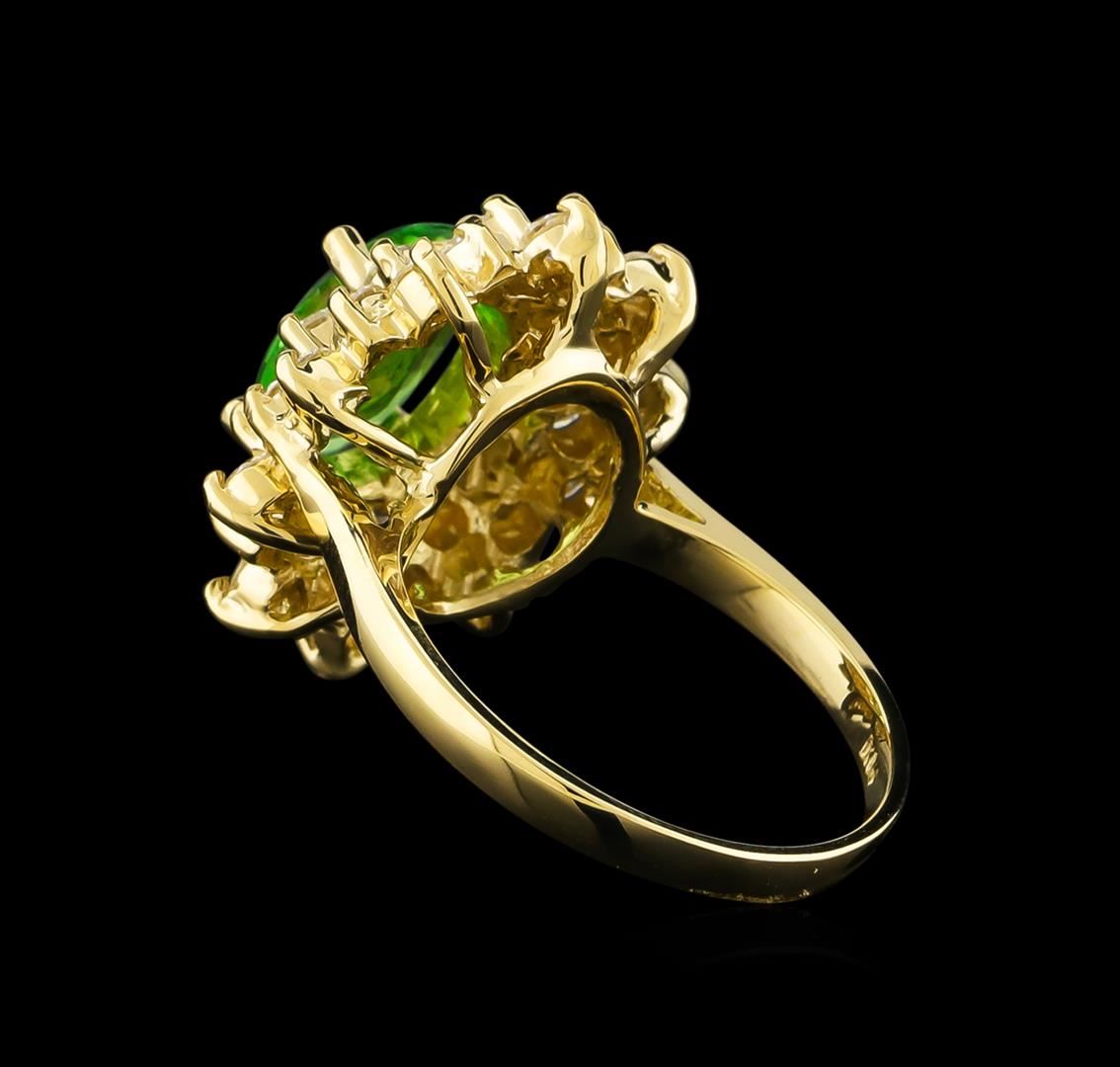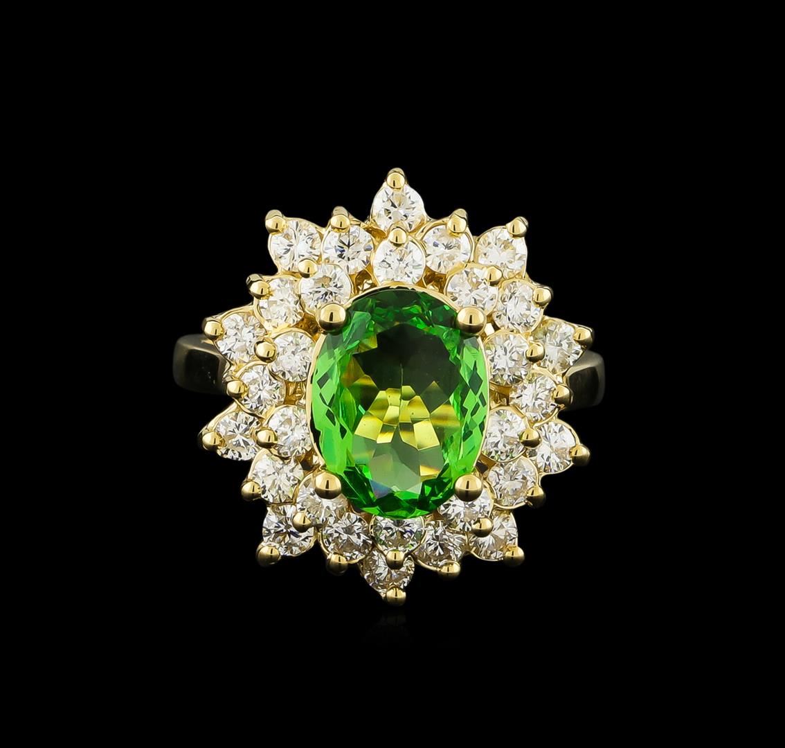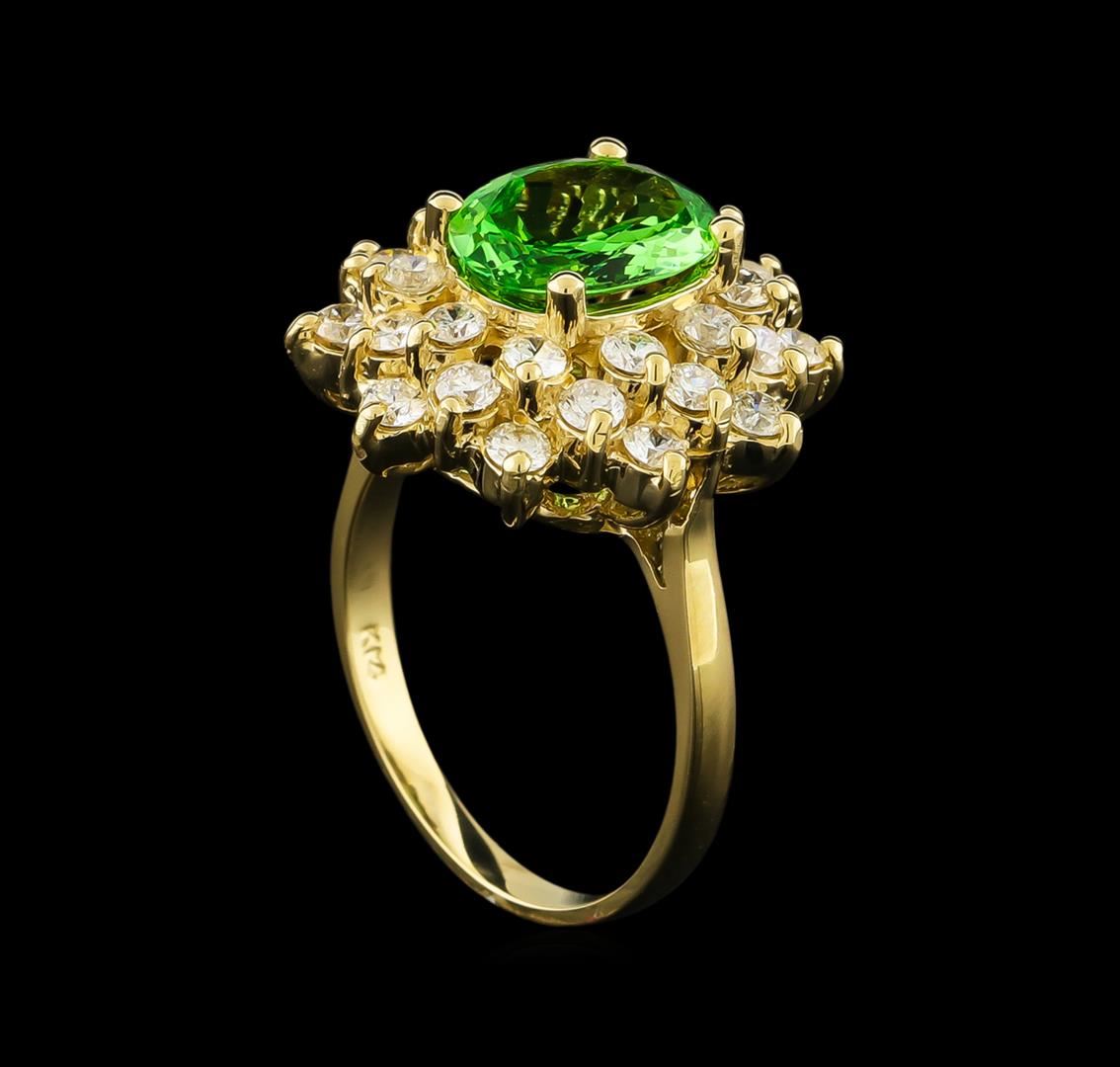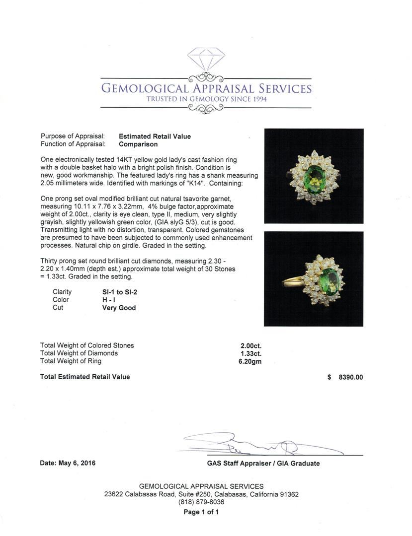 One electronically tested 14KT yellow gold lady's cast fashion ring with a double basket halo with a bright polish finish. The featured lady's ring has a shank measuring 2.05 millimeters wide. Identified with markings of "K14". Condition is new, good workmanship. Containing: One prong set oval modified brilliant cut natural tsavorite garnet, measuring 10.11 x 7.76 x 3.22mm, 4%. bulge factor, approximate weight of 2.00ct., clarity is eye clean, type II, medium, very slightly grayish, slightly yellowish green color, (GIA slyG 5/3), cut is good. Transmitting light with no distortion, transparent. Colored gemstones are presumed to have been subjected to commonly used enhancement processes. Natural chip on girdle. Graded in the setting. Thirty prong set round brilliant cut diamonds, measuring 2.30 - 2.20 x 1.40mm (depth est.) approximate total weight of 30 Stones = 1.33ct. Graded in the setting. Clarity: SI-1 to SI-2. Color: H - I. Cut Very Good. Total Weight of Colored Stones 2.00ct. Total Weight of Diamonds 1.33ct. Total Weight of Ring 6.20gm GAS Appraised at $8,390.00.