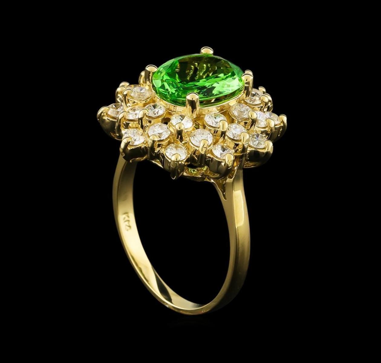 One electronically tested 14KT yellow gold lady's cast fashion ring with a double basket halo with a bright polish finish. The featured lady's ring has a shank measuring 2.05 millimeters wide. Identified with markings of "K14". Condition is new, good workmanship. Containing: One prong set oval modified brilliant cut natural tsavorite garnet, measuring 10.11 x 7.76 x 3.22mm, 4%. bulge factor, approximate weight of 2.00ct., clarity is eye clean, type II, medium, very slightly grayish, slightly yellowish green color, (GIA slyG 5/3), cut is good. Transmitting light with no distortion, transparent. Colored gemstones are presumed to have been subjected to commonly used enhancement processes. Natural chip on girdle. Graded in the setting. Thirty prong set round brilliant cut diamonds, measuring 2.30 - 2.20 x 1.40mm (depth est.) approximate total weight of 30 Stones = 1.33ct. Graded in the setting. Clarity: SI-1 to SI-2. Color: H - I. Cut Very Good. Total Weight of Colored Stones 2.00ct. Total Weight of Diamonds 1.33ct. Total Weight of Ring 6.20gm GAS Appraised.