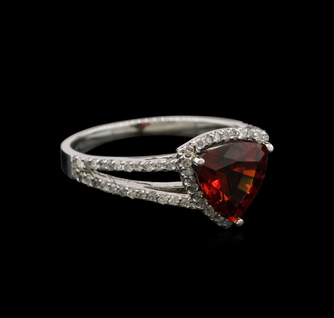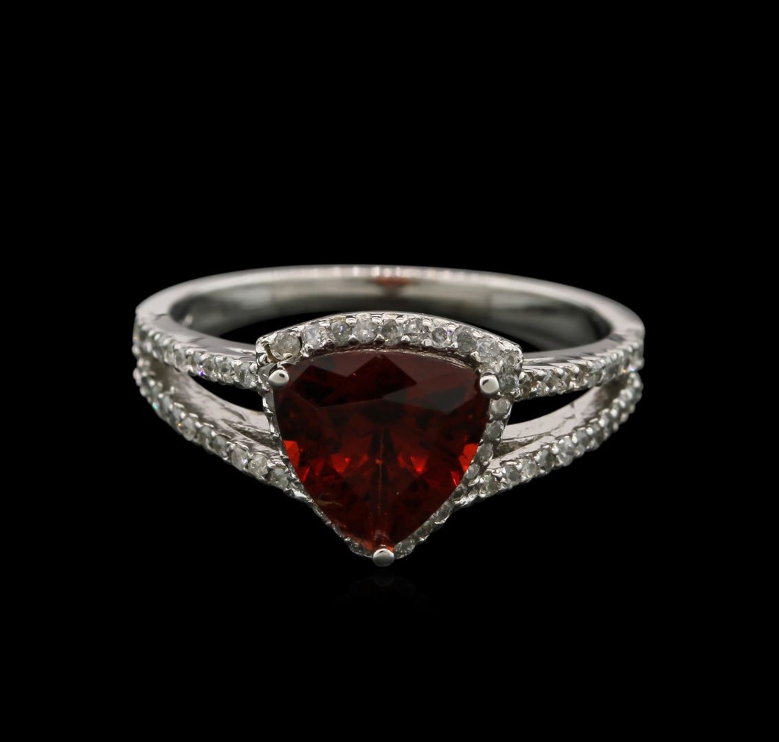 One electronically tested 18KT white gold ladies cast almandite garnet and diamond ring with a bright polish finish. The featured almandite garnet is set within a diamond bezel supported by diamond set split shoulders, completed by a one and one-half millimeter wide band. Identified with markings of "18K". Condition is good. Containing: One prong set triangle mixed cut natural almandite garnet approximate weight of 2.00ct., clarity is slightly included, type II, dark, very slightly brownish, orangy red color, (GIA oR 7/3), cut is good. Transmitting light with a minimum of distortion, transparent. Naturally occurring internal & external characteristics are present. Refractive index testing results of OTL. This is a conclusive result for almandite garnet. Graded in the setting. Seventy-Five prong set round brilliant cut diamonds, measuring 1.10 - 1.00 x 0.63mm approximate total weight of 75 Stones = 0.40ct. Graded in the setting. Clarity: I-1 to I-2. Color: H - J. Total Weight of Colored Stones 2.00ct. Total Weight of Diamonds 0.40ct. Total Weight of Ring 3.70gm. AIG Appraised at $2,110.00.