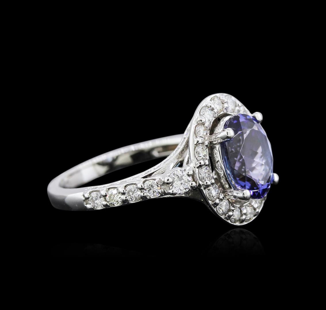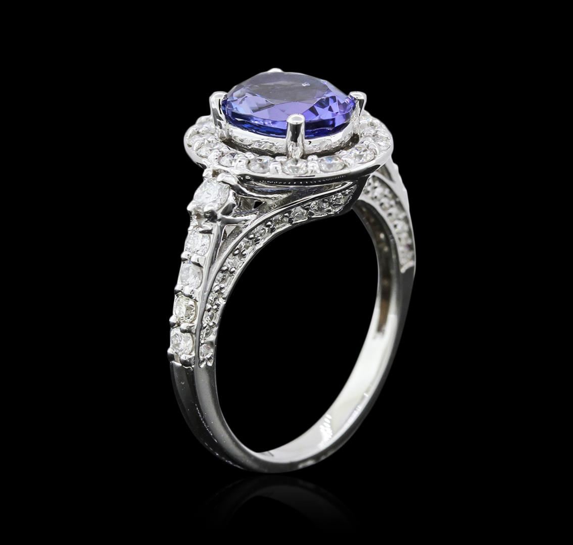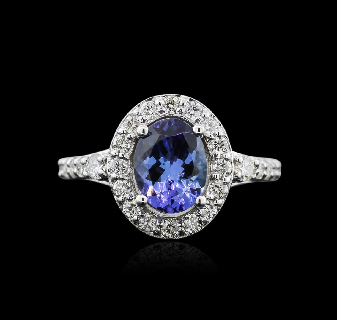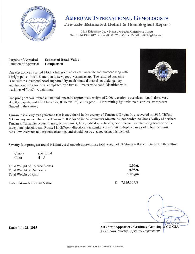 One electronically tested 14KT white gold ladies cast tanzanite and diamond ring with a bright polish finish. The featured tanzanite is set within a diamond bezel supported by an elaborate diamond set under gallery and diamond set shoulders, completed by a two millimeter wide band. Identified with markings of "14K". Condition is new, good workmanship. Containing: One prong set oval mixed cut natural tanzanite approximate weight of 2.00ct., clarity is eye clean, type I, dark, very slightly grayish, violetish blue color, (GIA vB 7/3), cut is good. Transmitting light with no distortion, transparent. Graded in the setting. Tanzanite is a very rare gemstone that is only found in the country of Tanzania. Originally discovered in 1967. Tiffany & Company, named the stone Tanzanite. It is found in the Usumburu Mountains that border the Umba Valley of northern Tanzania. Tanzanite occurs in gray, brown, violet, blue, reddish-purple, & green. The gem is interesting because of its exceptional pleochroism. Rotated in different directions a tanzanite will exhibit multiple changes of color. Tanzanite has a low tolerance to ultrasonic cleaning, and should not be cleaned using this method. Seventy-Four prong set round brilliant cut diamonds approximate total weight of 74 Stones = 0.95ct. Graded in the setting. Clarity SI-2 to I-1 Color H - J. Total Weight of Colored Stones 2.00ct. Total Weight of Diamonds 0.95ct. Total Weight of Ring 5.05 grams. AIG Appraised at $7,115.00.