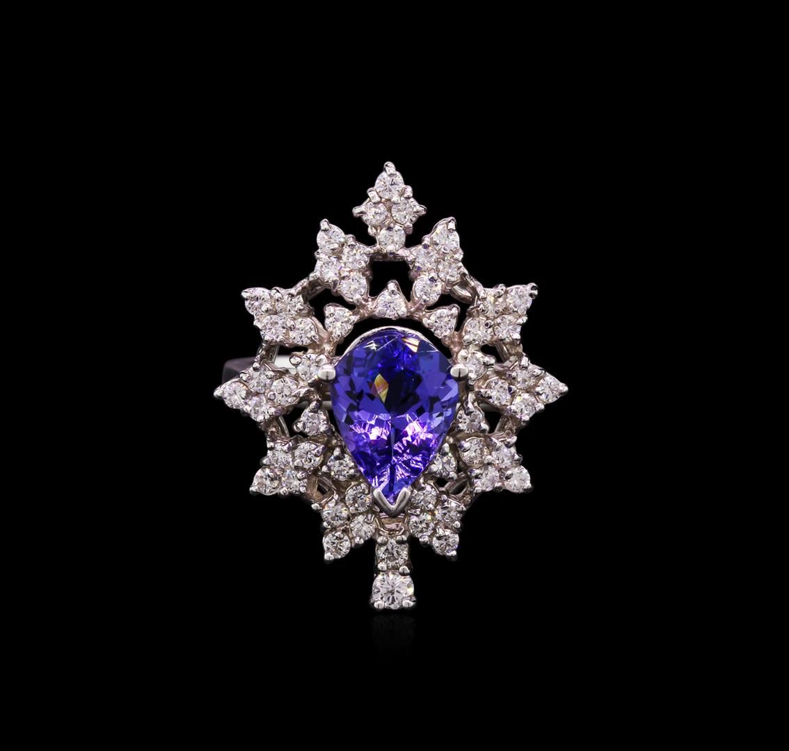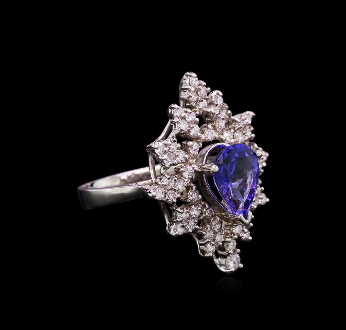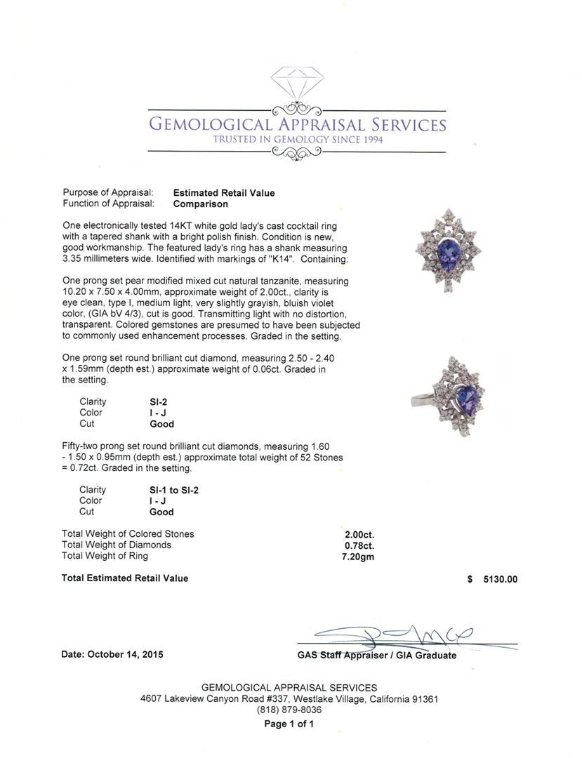 One electronically tested 14KT white gold lady's cast cocktail ring with a tapered shank with a bright polish finish. The featured lady's ring has a shank measuring 3.35 millimeters wide. Identified with markings of "K14". Condition is new, good workmanship. Containing: One prong set pear modified mixed cut natural tanzanite, measuring 10.20 x 7.50 x 4.00mm, approximate weight of 2.00ct., clarity is eye clean, type I, medium light, very slightly grayish, bluish violet color, (GIA bV 4/3), cut is good. Transmitting light with no distortion, transparent. Colored gemstones are presumed to have been subjected to commonly used enhancement processes. Graded in the setting. One prong set round brilliant cut diamond, measuring 2.50 - 2.40 x 1.59mm (depth est.) approximate weight of 0.06ct. Graded in the setting. Clarity: SI-2. Color: I - J. Cut Good Fifty-Two prong set round brilliant cut diamonds, measuring 1.60 - 1.50 x 0.95mm (depth est.) approximate total weight of 52 Stones = 0.72ct. Graded in the setting. Clarity: SI-1 to SI-2. Color: I - Good. Total Weight of Colored Stones 2.00ct. Total Weight of Diamonds 0.78ct. Total Weight of Ring 7.20gm. GAS Appraised at $5,130.00.