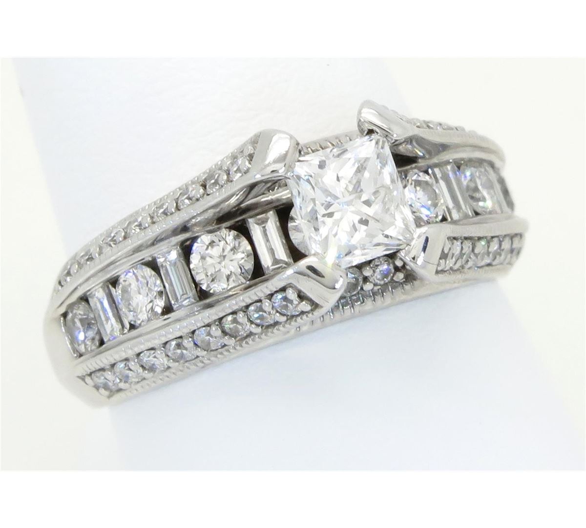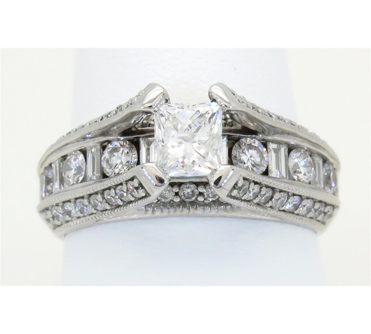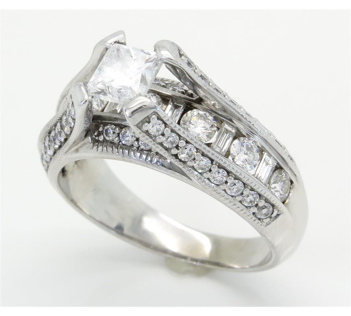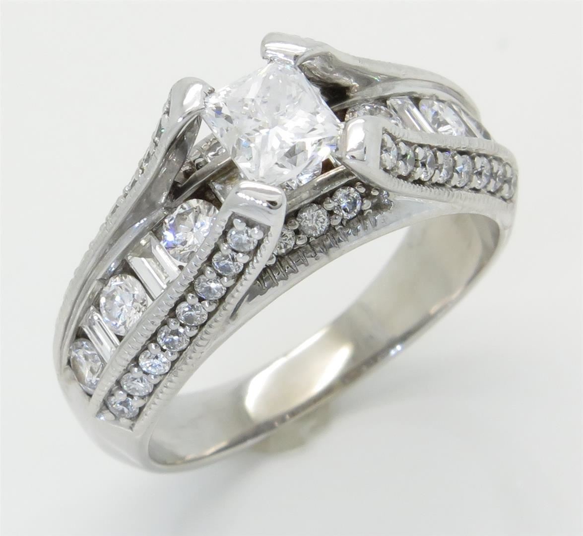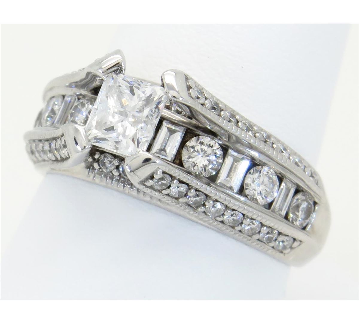 One tested 14K white gold diamond ring. Containing: One Princess Cut Diamond. Clarity: I1, Color: D-E. 45 Round Brilliant Cut Diamonds, 6 Baguette Cut Diamonds. Approximate Total diamond weight: 2.00CTW. Diamonds are graded in the mounting, unless otherwise stated. Weight of ring: 6.6 grams. Size 7.25.
