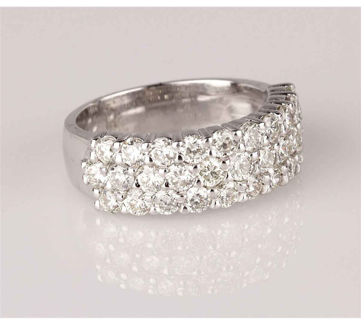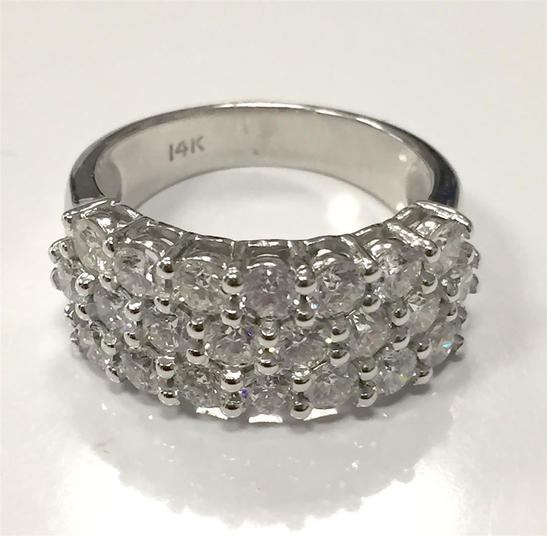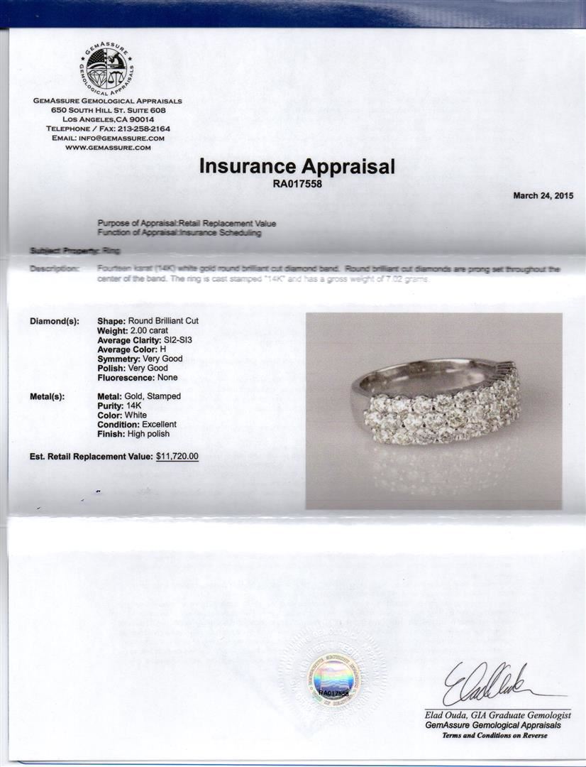Fourteen karat (14K) white gold round brilliant cut diamond band. Round brilliant cut diamonds are prong set throughout the center of the band. The ring is cast stamped "14K" and has a gross weight of 7.02 grams. Diamond(s): Shape: Round Brilliant Cut. Weight: 2.00 carat. Average Clarity: SI2-SI3. Average Color: H. Symmetry: Very Good. Polish: Very Good. Fluorescence: None. Metal(s): Metal: Gold, Stamped. Purity: 14K. Color: White. Condition: Excellent. Finish: High polish. GGA Appraised at $11,720.00.